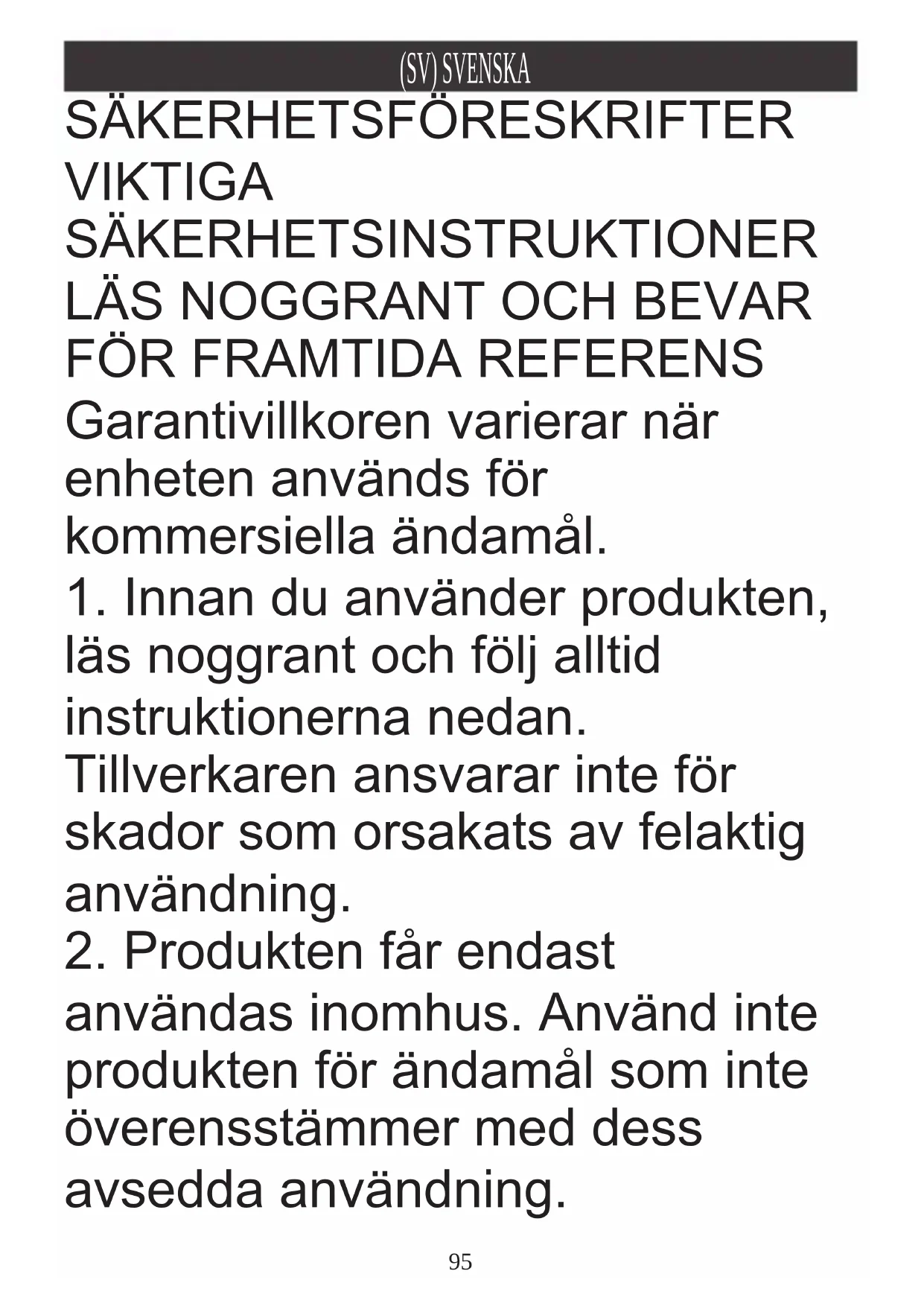 användas inomhus. Använd inte produkten för ändamål som inte överensstämmer med dess avsedda användning.96