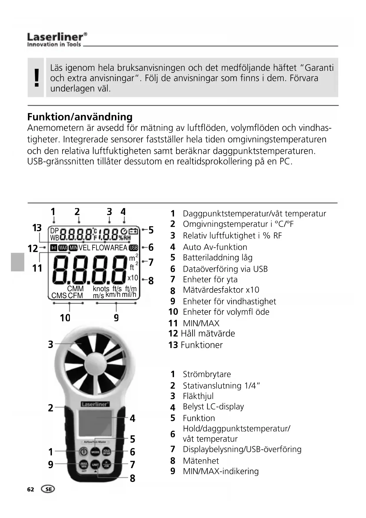 MIN/MAX 12 Håll mätvärde 13 Funktioner Funktion/användning Anemometern är avsedd för mätning av luft× öden, volym× öden och vindhas- tigheter. Integrerade sensorer fastställer hela tiden omgivningstemperaturen och den relativa luftfuktigheten samt beräknar daggpunktstemperaturen. USB-gränssnitten tillåter dessutom en realtidsprokollering på en PC. Läs igenom hela bruksanvisningen och det medföljande häftet “Garanti och extra anvisningar“. Följ de anvisningar som finns i dem. Förvara underlagen väl.