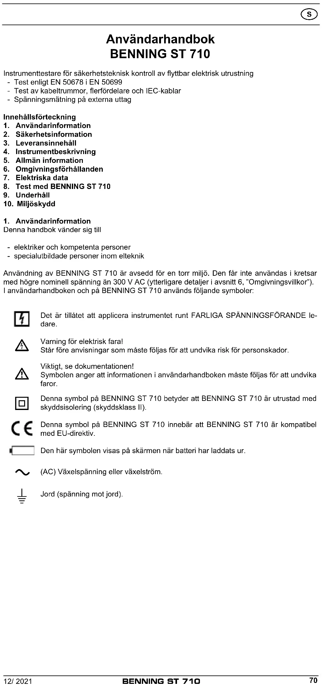 Användarhandbok BENNING ST 710 (050308)Klasse IClass I