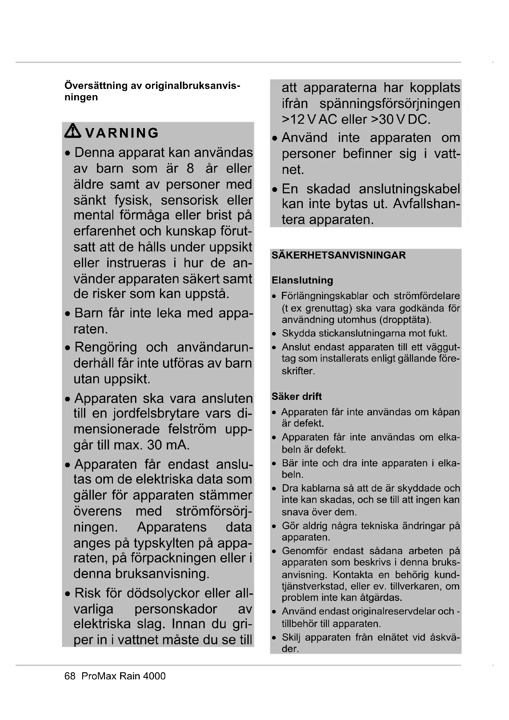 Välkommen till OASE Living Water. Med din nya produkt ProMax Rain 4000 har du gjort ett bra val. Läs igenom bruksanvisningen noggrant före första användningstillfället och ta reda på hur apparaten fungerar. Alla slags arbeten som utförs på denna apparat får endast genomföras enligt föreliggande in- struktioner. Beakta noga säkerhetsanvisningarna, de är en förutsättning för korrekt och säker användning. Förvara denna bruksanvisning på ett sä- kert ställe. Om apparaten byter ägare måste även bruksanvisningen följa med. Symboler i denna bruksanvisning Varningsanvisningar Varningsanvisningarna i denna bruksan- visning är indelade med signalord som vi- sar omfattningen av faran. VARNING