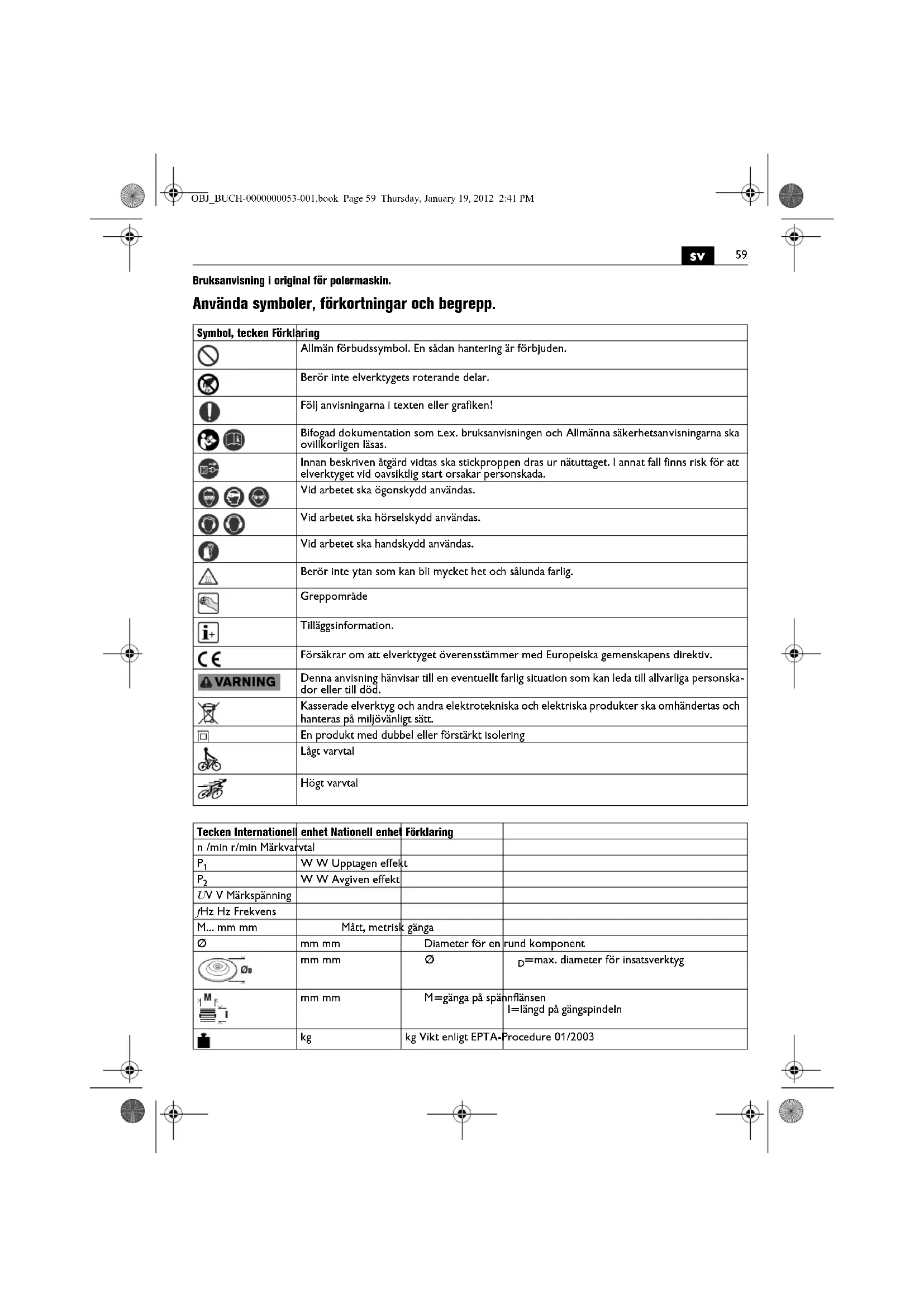 Anvind inte detta elverktyg innan du nogrant last och fullstandigt forstende dotta instruktionsbok samt bifogade ,Allmanna sakerhetsanvisingar