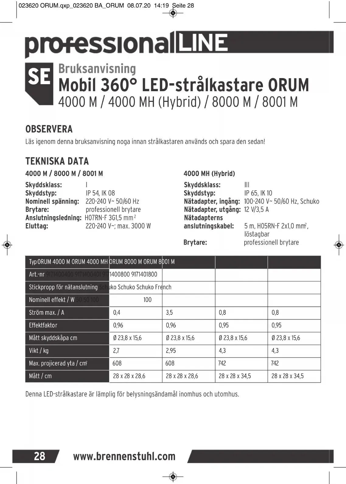 www.professionalline.com 31 023620 ORUM.qxp_023620 BA_ORUM 08.07.20 14:19 Seite 316. En förstörd skyddskåpa skall bytas ut mot en original-skyddskåpa från Brennenstuhl innan strålkastaren fortsätter att användas.