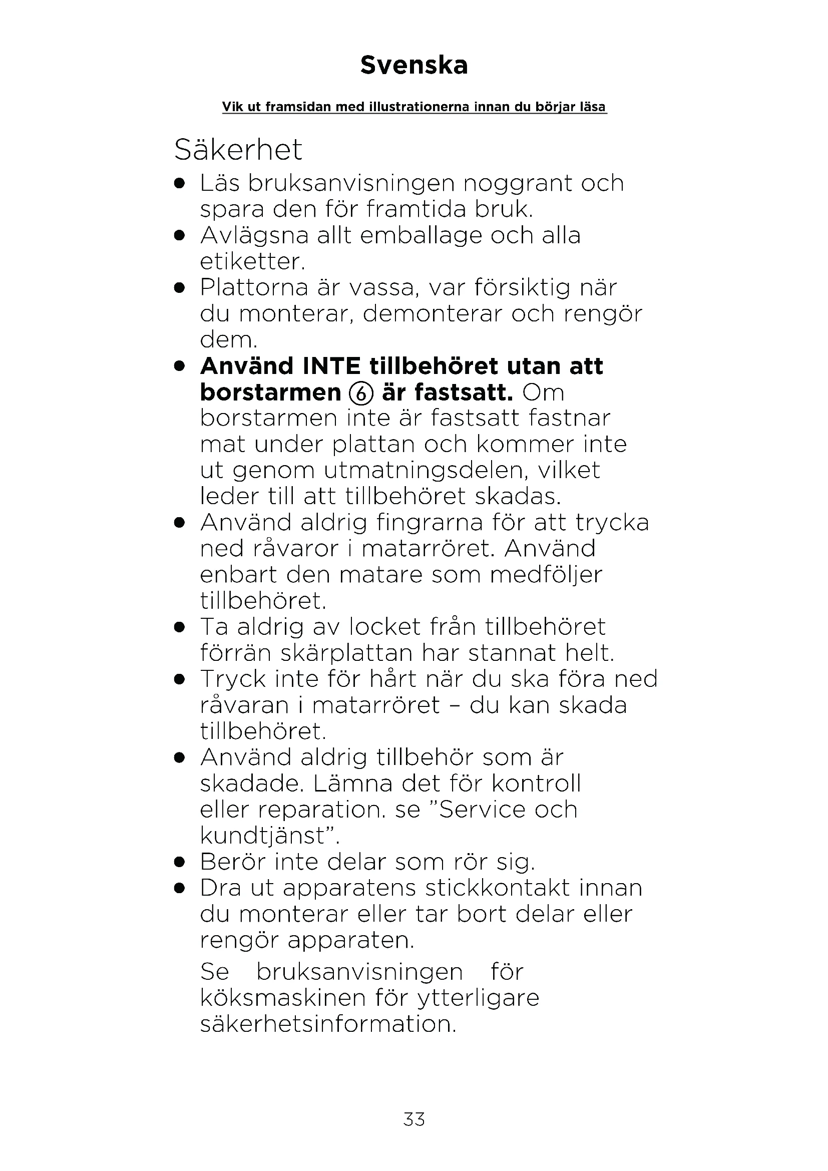 Använd aldrig fingrarna för att trycka ned råvaror i matarröret. Använd enbart den matare som medföljer tillbehöret.
