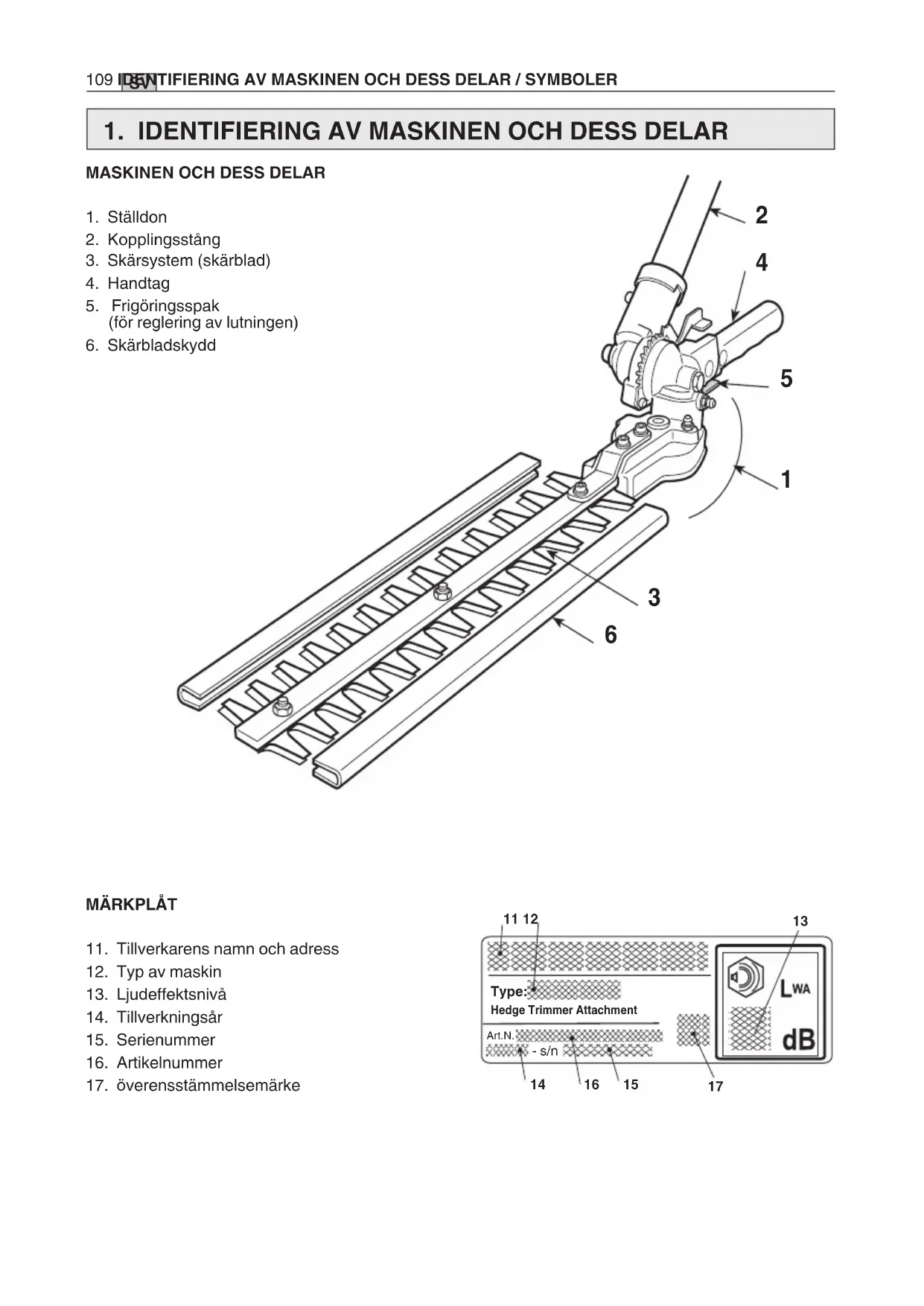 tillverkad för dvs. ”klippa och jämna häckar, som består av tunna stammar med små grenar”. All annan användning kan vara farlig och skada ma- skinen. Följande anses som felaktig användning (som ex- empel, men inte uteslutande): – gräsklippning i allmänhet och speciellt nära rep; – malning av material för kompostering; – beskärningar; – använda maskinen för ett annat material än väx- ter och planter; – att maskinen används av era personer. 3)Tillåt aldrig att maskinen används av barn eller av personer som inte känner till instruktionerna tillräckligt. Lokala bestämmelser kan ange en mi- nimiålder för dess användning.