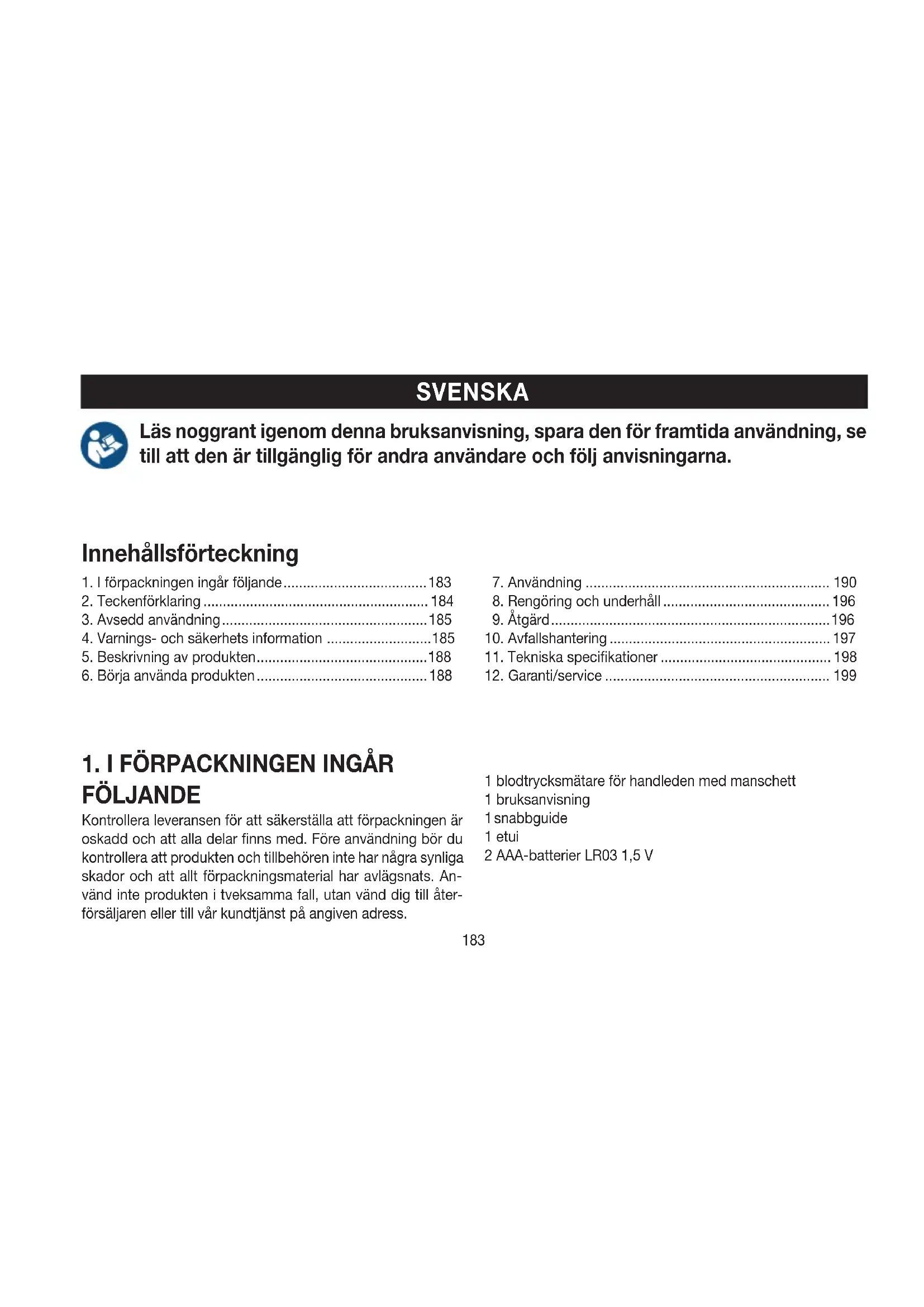 FÖLJANDE Kontrollera leveransen för att säkerställa att förpackningen är oskadd och att alla delar finns med. Före användning bör du kontrollera att produkten och tillbehören inte har några synliga skador och att allt förpackningsmaterial har avlägsnats. An- vänd inte produkten i tveksamma fall, utan vänd dig till åter- försäljaren eller till vår kundtjänst på angiven adress. 1 blodtrycksmätare för handleden med manschett 1 bruksanvisning 1 snabbguide 1 etui 2 AAA-batterier LR03 1,5 V184