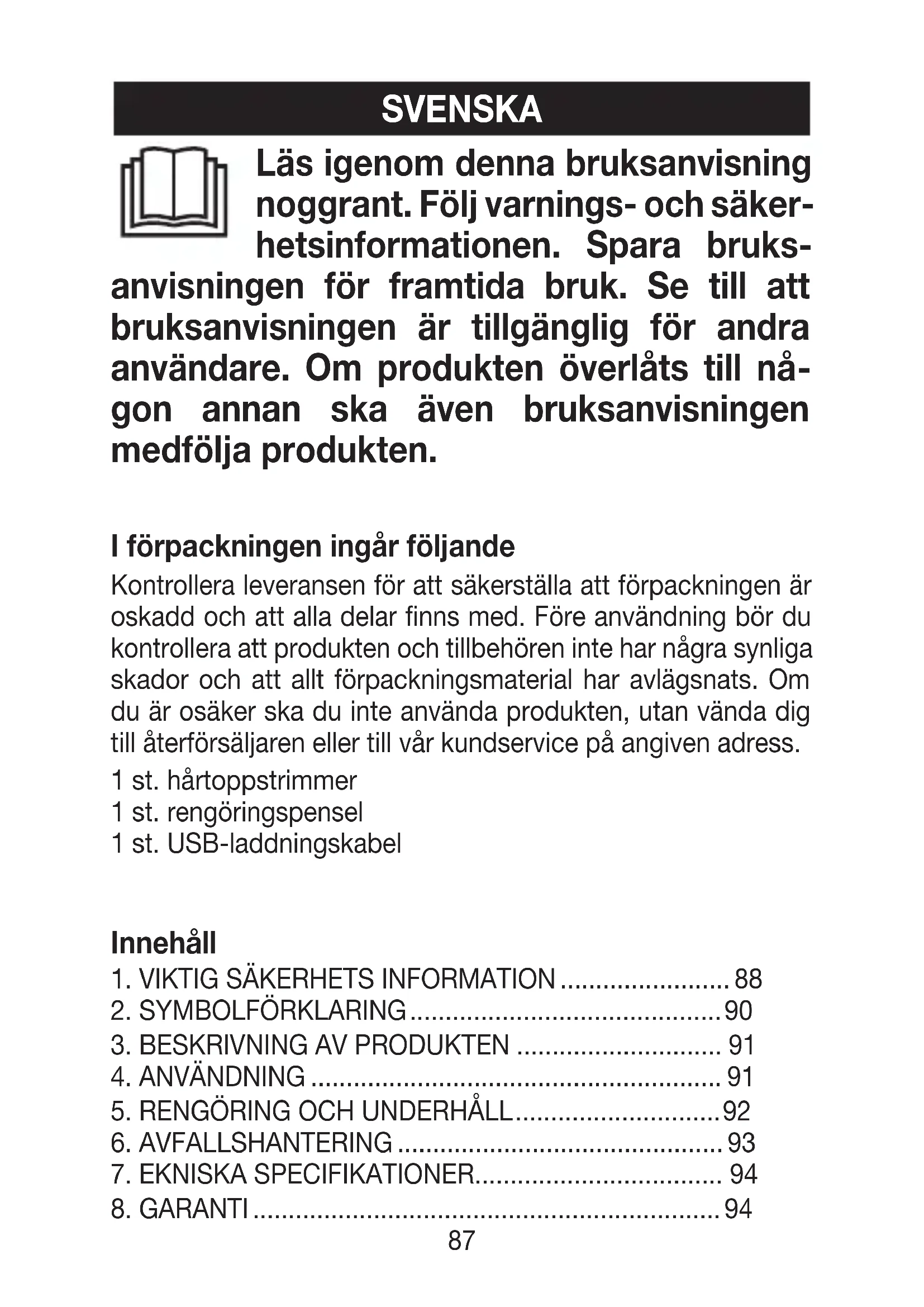 Innehåll I förpackningen ingår följande Kontrollera leveransen för att säkerställa att förpackningen är oskadd och att alla delar finns med. Före användning bör du kontrollera att produkten och tillbehören inte har några synliga skador och att allt förpackningsmaterial har avlägsnats. Om du är osäker ska du inte använda produkten, utan vända dig till återförsäljaren eller till vår kundservice på angiven adress. 1 st. hårtoppstrimmer 1 st. rengöringspensel 1 st. USB-laddningskabel88