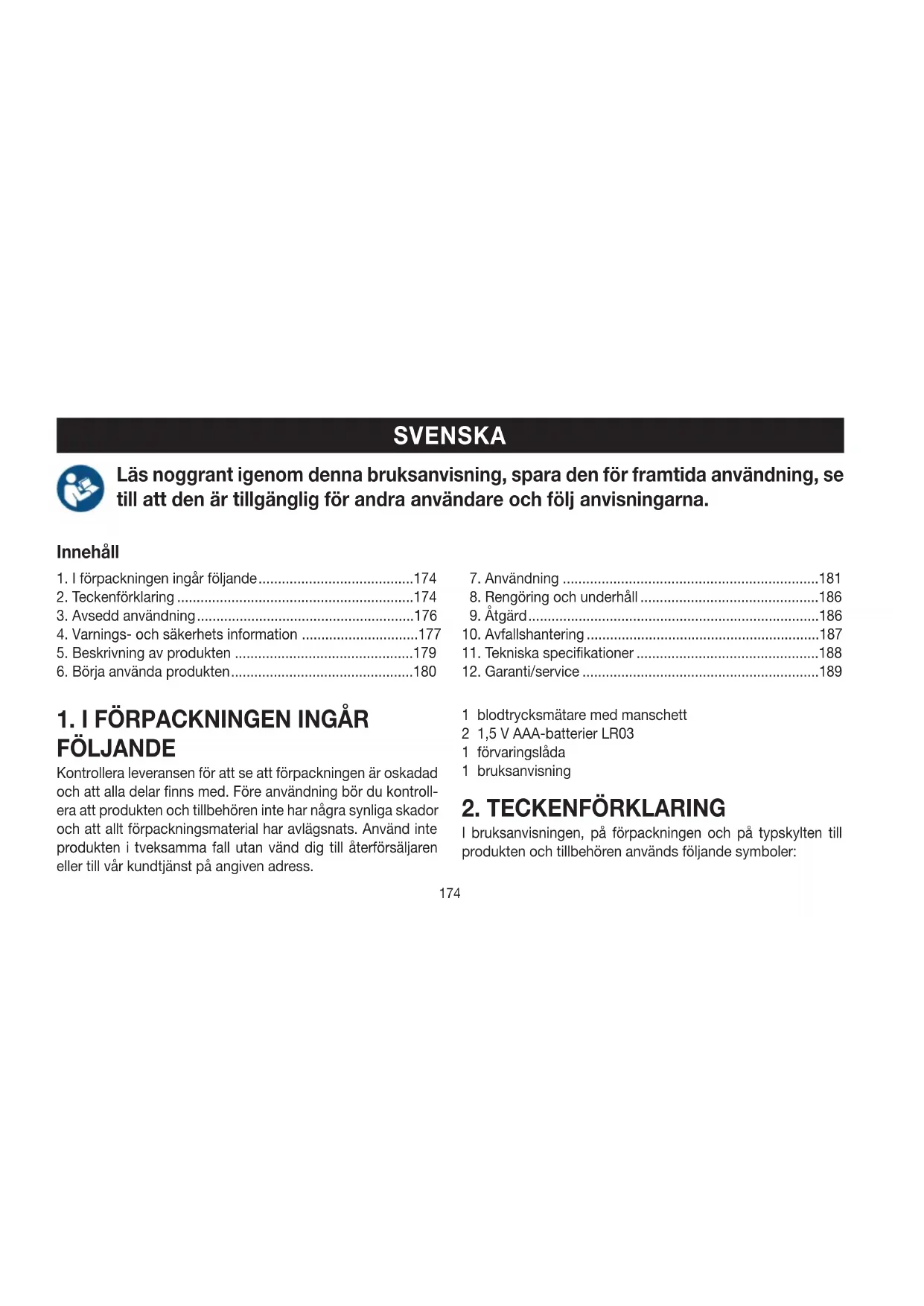 FÖLJANDE Kontrollera leveransen för att se att förpackningen är oskadad och att alla delar finns med. Före användning bör du kontroll- era att produkten och tillbehören inte har några synliga skador och att allt förpackningsmaterial har avlägsnats. Använd inte produkten i tveksamma fall utan vänd dig till återförsäljaren eller till vår kundtjänst på angiven adress. 1 blodtrycksmätare med manschett 2 1,5V AAA-batterier LR03 1 förvaringslåda 1 bruksanvisning