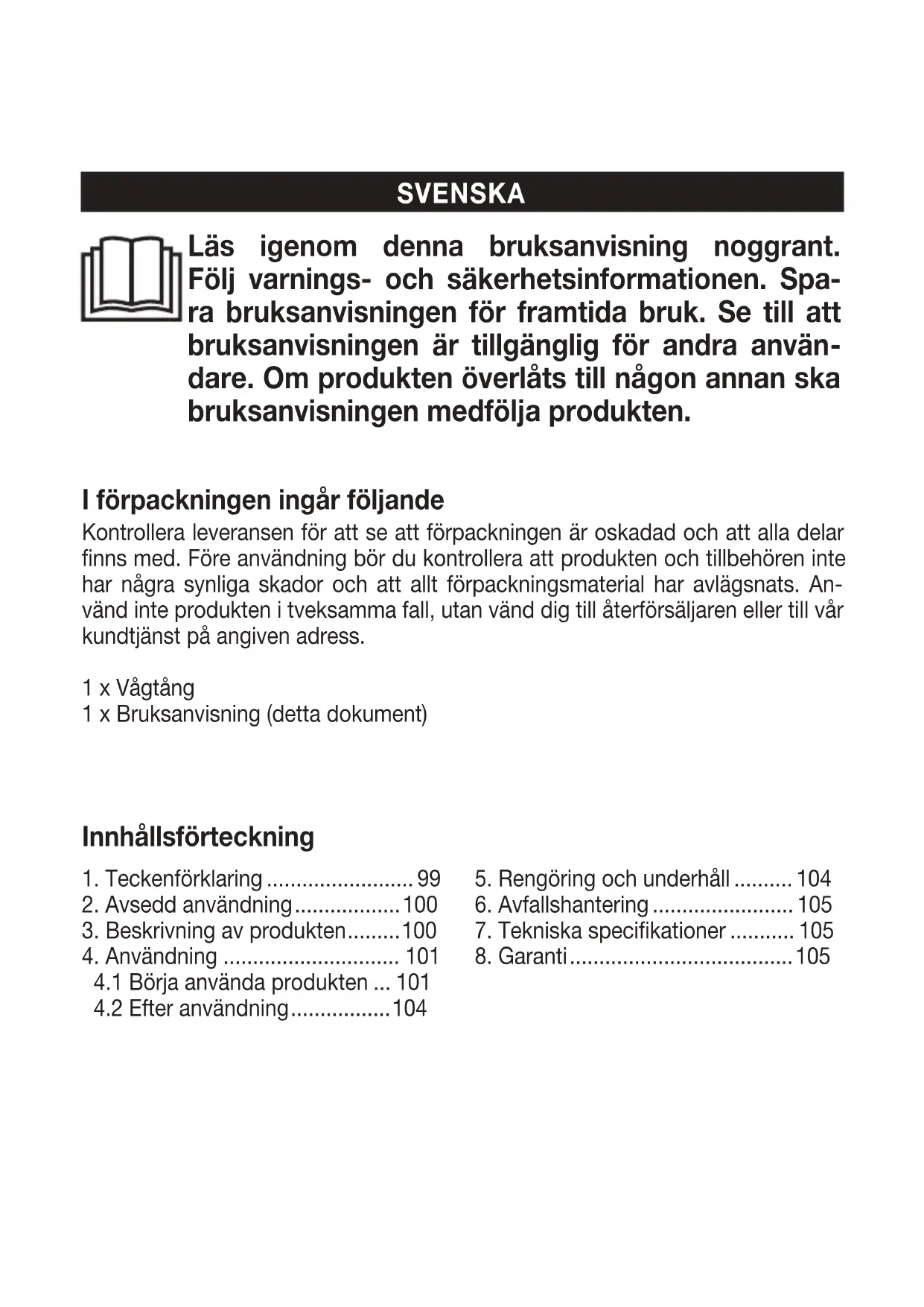 dare. Om produkten överlåts till någon annan ska bruksanvisningen medfölja produkten. I förpackningen ingår följande Kontrollera leveransen för att se att förpackningen är oskadad och att alla delar finns med. Före användning bör du kontrollera att produkten och tillbehören inte har några synliga skador och att allt förpackningsmaterial har avlägsnats. An- vänd inte produkten i tveksamma fall, utan vänd dig till återförsäljaren eller till vår kundtjänst på angiven adress. 1 x Vågtång 1 x Bruksanvisning (detta dokument)