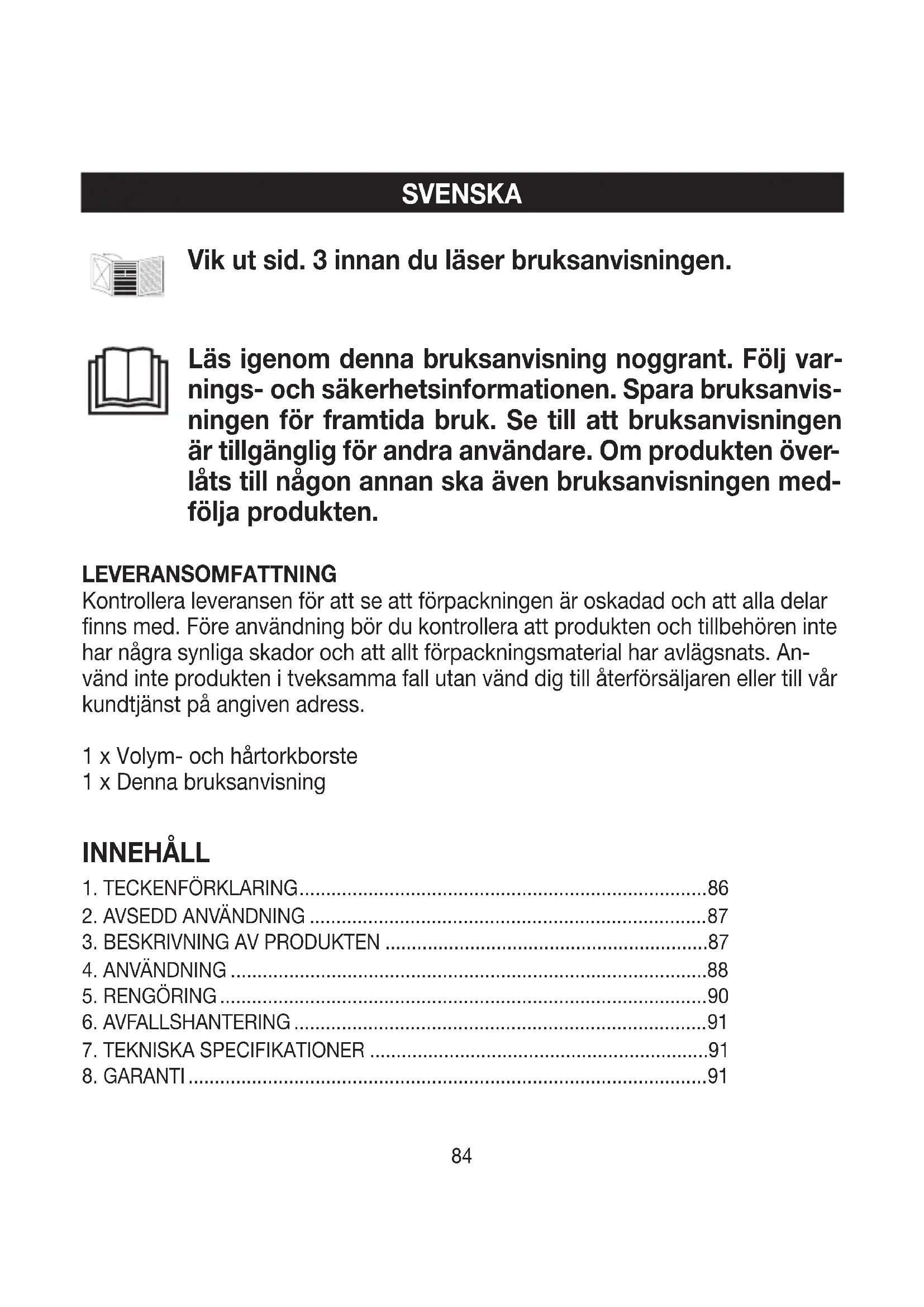 låts till någon annan ska även bruksanvisningen med- följa produkten. Vik ut sid. 3 innan du läser bruksanvisningen. INNEHÅLL LEVERANSOMFATTNING Kontrollera leveransen för att se att förpackningen är oskadad och att alla delar finns med. Före användning bör du kontrollera att produkten och tillbehören inte har några synliga skador och att allt förpackningsmaterial har avlägsnats. An- vänd inte produkten i tveksamma fall utan vänd dig till återförsäljaren eller till vår kundtjänst på angiven adress. 1 x Volym- och hårtorkborste 1 x Denna bruksanvisning