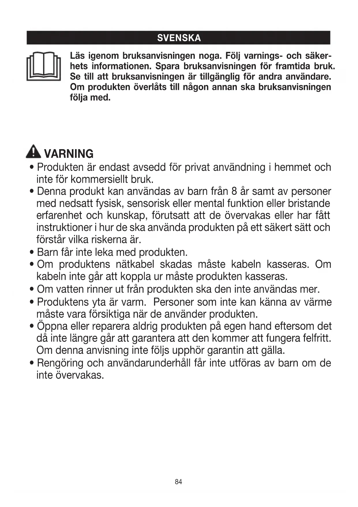Nærmere oplysninger om garantien og garantibetingelserne findes idet medfølgende garantihæfte.84 Läs igenom bruksanvisningen noga. Följ varnings- och säker- hets informationen. Spara bruksanvisningen för framtida bruk. Se till att bruksanvisningen är tillgänglig för andra användare. Om produkten överlåts till någon annan ska bruksanvisningen följa med. SVENSKA VARNING
