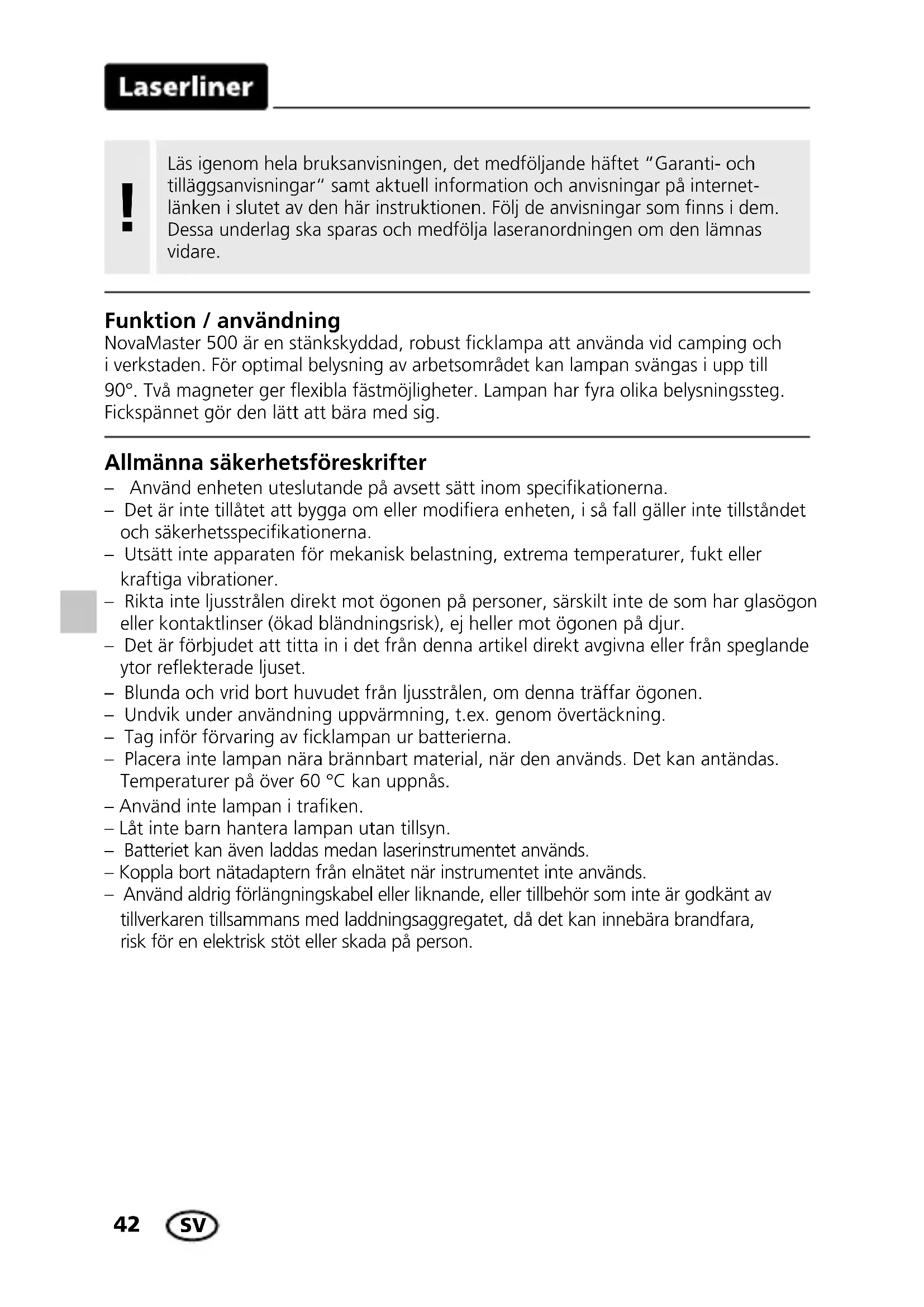 Allmänna säkerhetsföreskrifter – Använd enheten uteslutande på avsett sätt inom specifikationerna. – Det är inte tillåtet att bygga om eller modifiera enheten, i så fall gäller inte tillståndet och säkerhetsspecifikationerna. – Utsätt inte apparaten för mekanisk belastning, extrema temperaturer, fukt eller kraftiga vibrationer. – Rikta inte ljusstrålen direkt mot ögonen på personer, särskilt inte de som har glasögon eller kontaktlinser (ökad bländningsrisk), ej heller mot ögonen på djur. – Det är förbjudet att titta in i det från denna artikel direkt avgivna eller från speglande ytor reekterade ljuset. – Blunda och vrid bort huvudet från ljusstrålen, om denna träffar ögonen. – Undvik under användning uppvärmning, t.ex. genom övertäckning. – Tag inför förvaring av cklampan ur batterierna. – Placera inte lampan nära brännbart material, när den används. Det kan antändas. Temperaturer på över 60 °C kan uppnås. – Använd inte lampan i traken. – Låt inte barn hantera lampan utan tillsyn. – Batteriet kan även laddas medan laserinstrumentet används. – Koppla bort nätadaptern från elnätet när instrumentet inte används. – Använd aldrig förlängningskabel eller liknande, eller tillbehör som inte är godkänt av tillverkaren tillsammans med laddningsaggregatet, då det kan innebära brandfara, risk för en elektrisk stöt eller skada på person. Funktion / användning NovaMaster 500 är en stänkskyddad, robust cklampa att använda vid camping och i verkstaden. För optimal belysning av arbetsområdet kan lampan svängas i upp till 90°. Två magneter ger exibla fästmöjligheter. Lampan har fyra olika belysningssteg. Fickspännet gör den lätt att bära med sig. Läs igenom hela bruksanvisningen, det medföljande häftet “Garanti- och tilläggsanvisningar“ samt aktuell information och anvisningar på internet- länken i slutet av den här instruktionen. Följ de anvisningar som finns i dem. Dessa underlag ska sparas och medfölja laseranordningen om den lämnas vidare. !NovaMaster 500