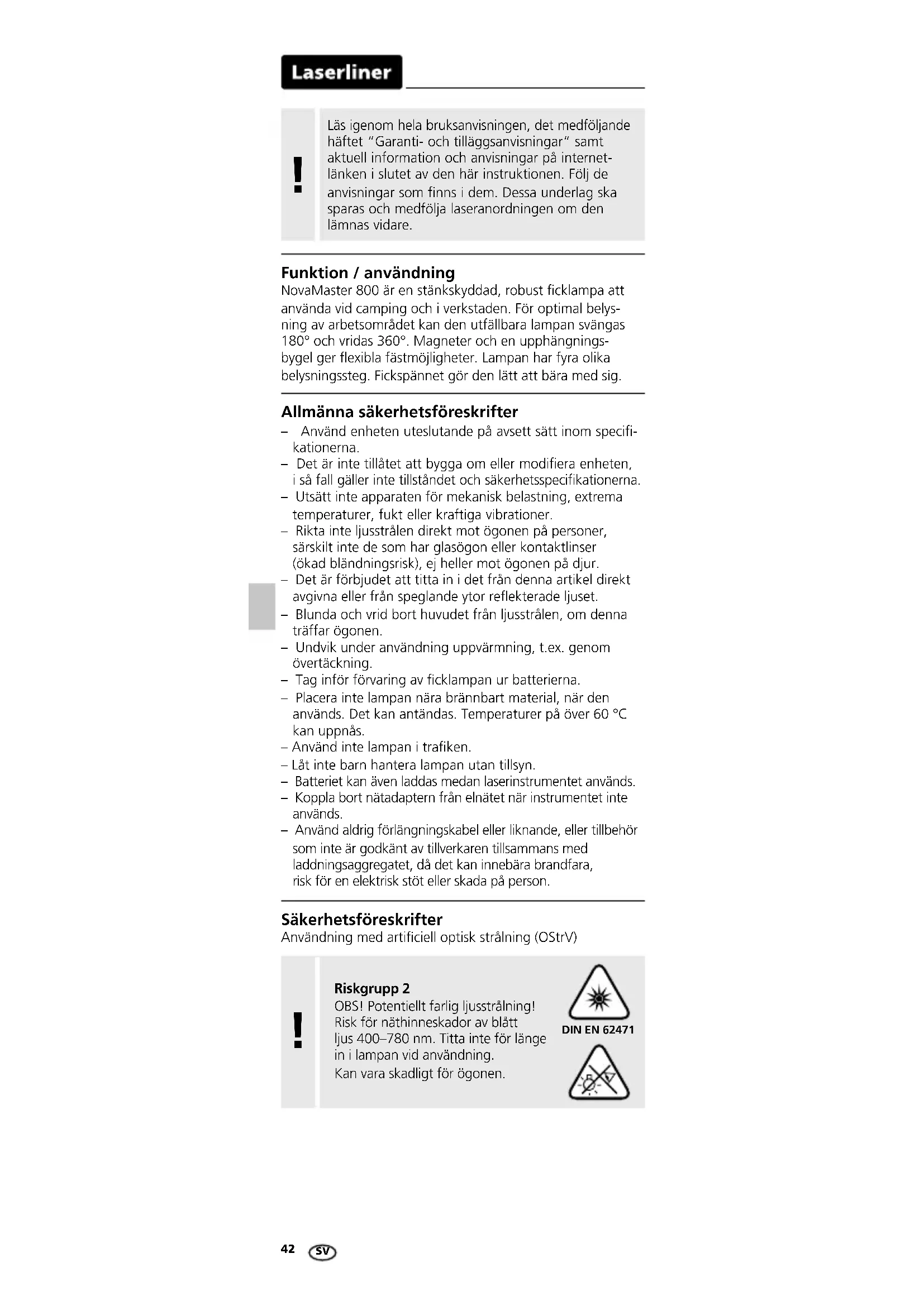 Säkerhetsföreskrifter Användning med articiell optisk strålning (OStrV) Allmänna säkerhetsföreskrifter – Använd enheten uteslutande på avsett sätt inom specifi- kationerna. – Det är inte tillåtet att bygga om eller modifiera enheten, i så fall gäller inte tillståndet och säkerhetsspecifikationerna. – Utsätt inte apparaten för mekanisk belastning, extrema temperaturer, fukt eller kraftiga vibrationer. – Rikta inte ljusstrålen direkt mot ögonen på personer, särskilt inte de som har glasögon eller kontaktlinser (ökad bländningsrisk), ej heller mot ögonen på djur. – Det är förbjudet att titta in i det från denna artikel direkt avgivna eller från speglande ytor reekterade ljuset. – Blunda och vrid bort huvudet från ljusstrålen, om denna träffar ögonen. – Undvik under användning uppvärmning, t.ex. genom övertäckning. – Tag inför förvaring av cklampan ur batterierna. – Placera inte lampan nära brännbart material, när den används. Det kan antändas. Temperaturer på över 60 °C kan uppnås. – Använd inte lampan i traken. – Låt inte barn hantera lampan utan tillsyn. – Batteriet kan även laddas medan laserinstrumentet används. – Koppla bort nätadaptern från elnätet när instrumentet inte används. – Använd aldrig förlängningskabel eller liknande, eller tillbehör som inte är godkänt av tillverkaren tillsammans med laddningsaggregatet, då det kan innebära brandfara, risk för en elektrisk stöt eller skada på person. Funktion / användning NovaMaster 800 är en stänkskyddad, robust cklampa att använda vid camping och i verkstaden. För optimal belys- ning av arbetsområdet kan den utfällbara lampan svängas 180° och vridas 360°. Magneter och en upphängnings- bygel ger exibla fästmöjligheter. Lampan har fyra olika belysningssteg. Fickspännet gör den lätt att bära med sig. Läs igenom hela bruksanvisningen, det medföljande häftet “Garanti- och tilläggsanvisningar“ samt aktuell information och anvisningar på internet- länken i slutet av den här instruktionen. Följ de anvisningar som finns i dem. Dessa underlag ska sparas och medfölja laseranordningen om den lämnas vidare.