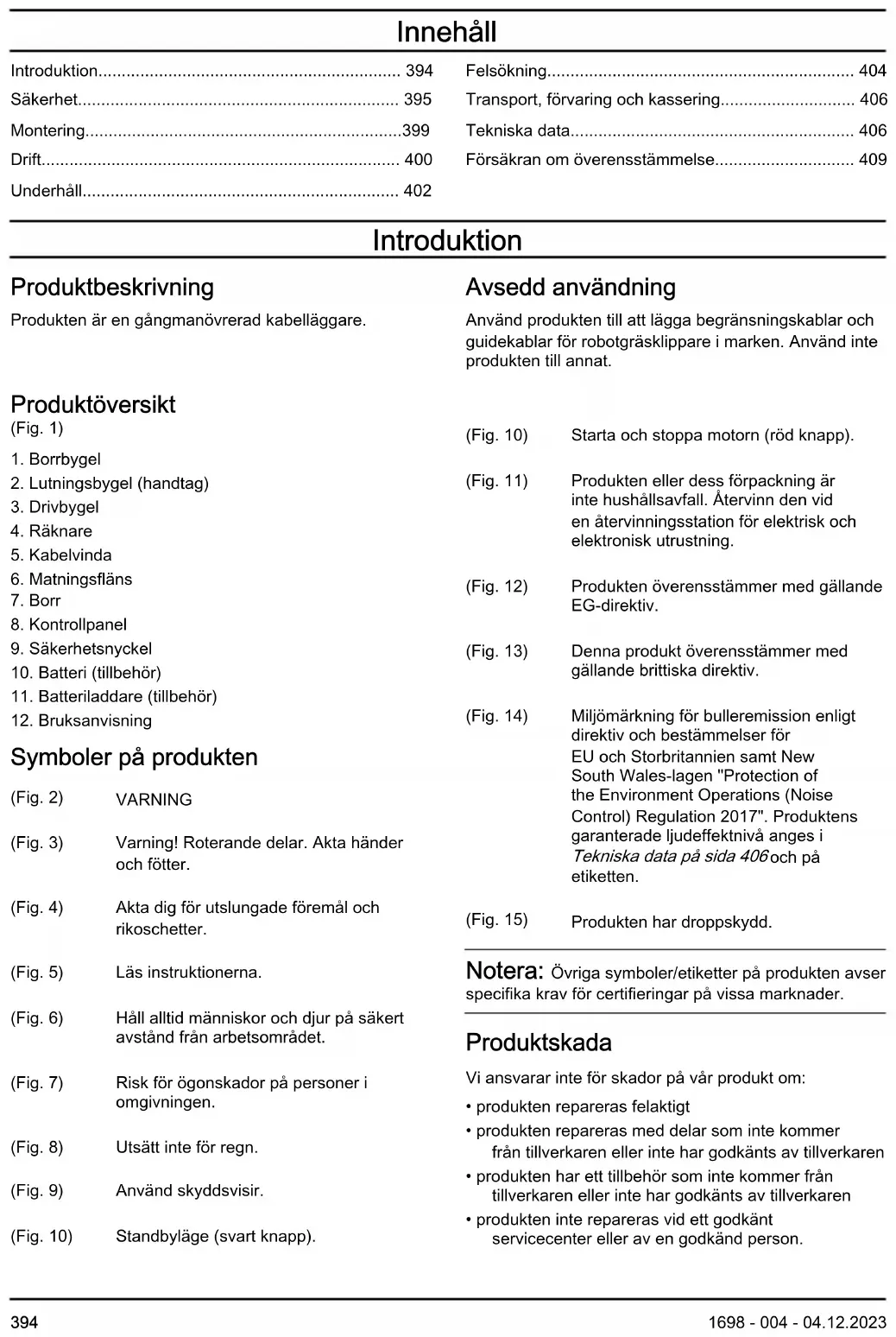 Symboler på produkten (Fig. 2) VARNING (Fig. 3) Varning! Roterande delar. Akta händer och fötter. (Fig. 4) Akta dig för utslungade föremål och rikoschetter. (Fig. 5) Läs instruktionerna. (Fig. 6) Håll alltid människor och djur på säkert avstånd från arbetsområdet. (Fig. 7) Risk för ögonskador på personer i omgivningen. (Fig. 8) Utsätt inte för regn. (Fig. 9) Använd skyddsvisir. (Fig. 10) Standbyläge (svart knapp). (Fig. 10) Starta och stoppa motorn (röd knapp). (Fig. 11) Produkten eller dess förpackning är inte hushållsavfall. Återvinn den vid en återvinningsstation för elektrisk och elektronisk utrustning. (Fig. 12) Produkten överensstämmer med gällande EG-direktiv. (Fig. 13) Denna produkt överensstämmer med gällande brittiska direktiv. (Fig. 14) Miljömärkning för bulleremission enligt direktiv och bestämmelser för EU och Storbritannien samt New South Wales-lagen "Protection of the Environment Operations (Noise Control) Regulation 2017". Produktens garanterade ljudeffektnivå anges i Tekniska data på sida 406 och på etiketten. (Fig. 15) Produkten har droppskydd. Notera: Övriga symboler/etiketter på produkten avser specifika krav för certifieringar på vissa marknader. Produktskada Vi ansvarar inte för skador på vår produkt om: