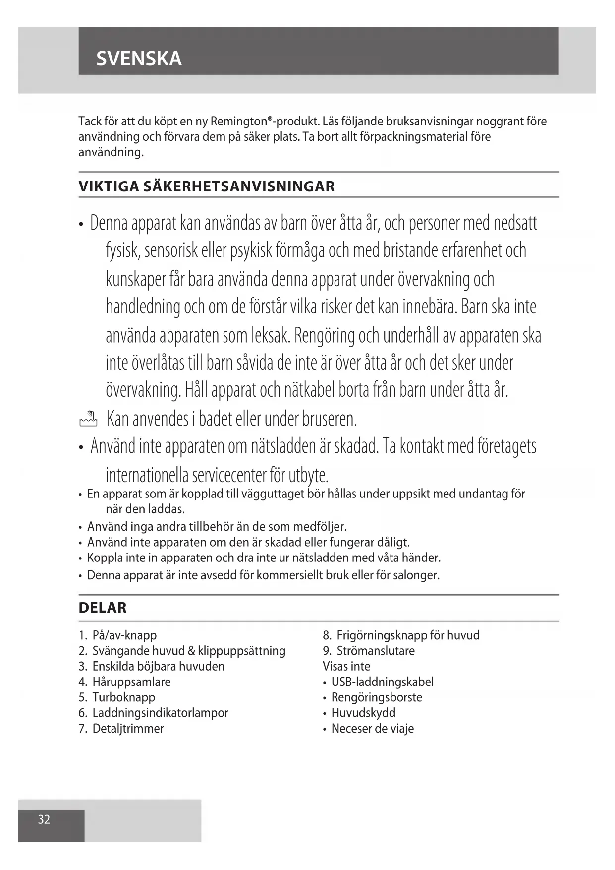 AE32 SVENSKA Tack för att du köpt en ny Remington®-produkt. Läs följande bruksanvisningar noggrant före användning och förvara dem på säker plats. Ta bort allt förpackningsmaterial före användning.