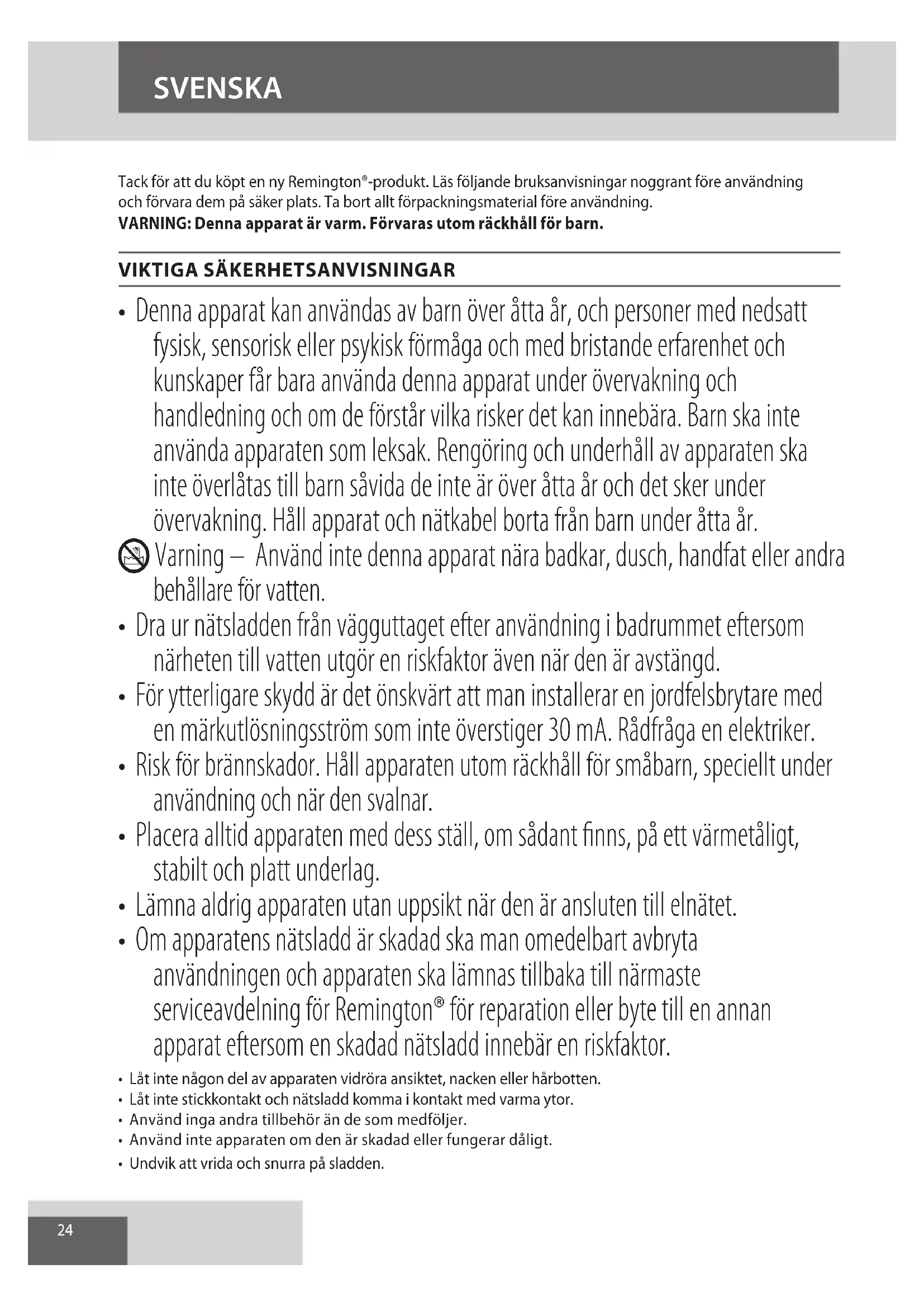 AE24 SVENSKA Tack för att du köpt en ny Remington®-produkt. Läs följande bruksanvisningar noggrant före användning och förvara dem på säker plats. Ta bort allt förpackningsmaterial före användning. VARNING: Denna apparat är varm. Förvaras utom räckhåll för barn.