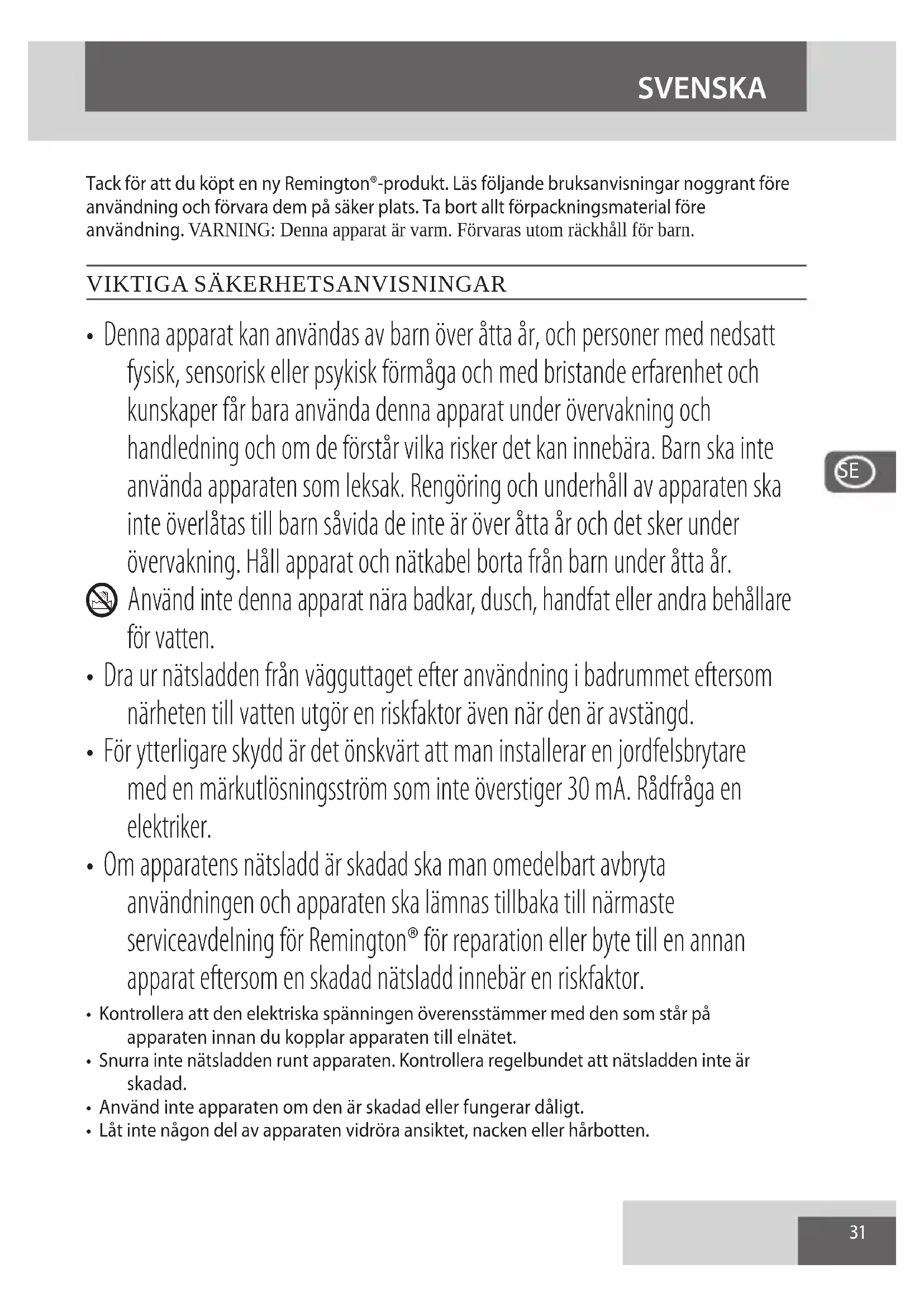 - Om apparatens nätsladd är skadad ska man omedelbart avbryta användningen och apparaten ska lämnas tillbaka till närmaste serviceavdelning för Remington® för reparation eller byte till en annan apparat eftersom en skadad nätsladd innebär en riskfaktor.