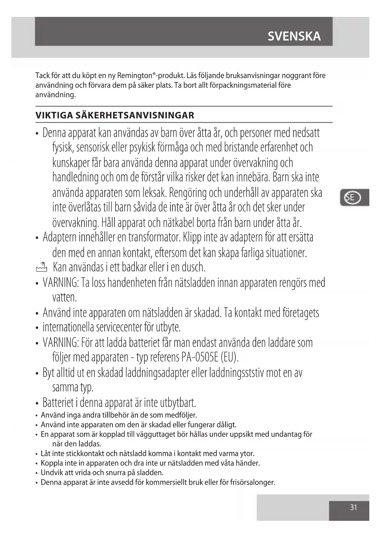 För att undvika miljö- och hälsoproblem pga. farliga ämnen får man inte kassera apparater eller laddningsbara och icke-laddningsbara batterier märkta med någon av dessa symboler i osorterat kommunalt avfall. Elektriska och elektroniska produkter och, där tillämpligt, laddningsbara och icke-laddningsbara batterier ska alltid kasseras vid en lämplig, ociell återvinnings-/uppsamlingsstation.35 NORSK Takk for at du kjøper et nytt Remington®-produkt. Vennligst les denne bruksanvisningen godt og legg den på et trygt sted. Fjern all emballasje før bruk. VIKTIG SIKKERHETSTILTAK