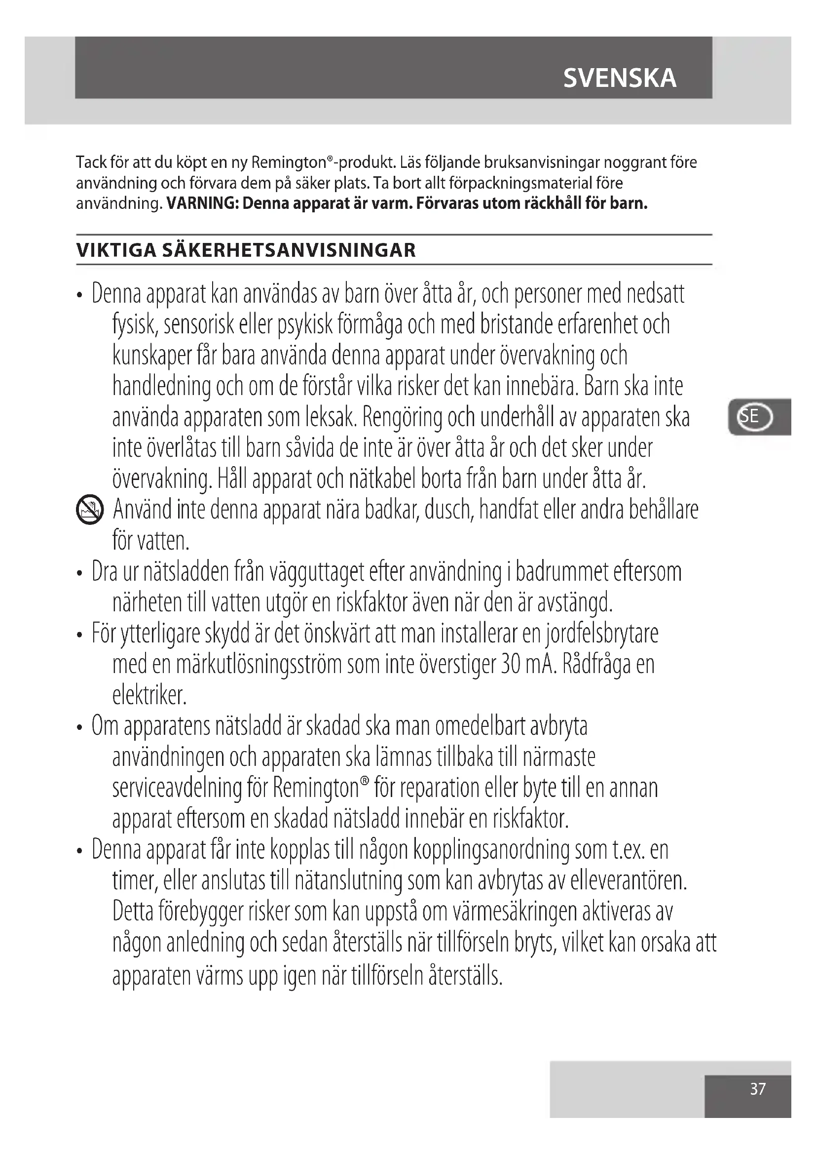 - Om apparatens nätsladd är skadad ska man omedelbart avbryta användningen och apparaten ska lämnas tillbaka till närmaste serviceavdelning för Remington® för reparation eller byte till en annan apparat eftersom en skadad nätsladd innebär en riskfaktor.