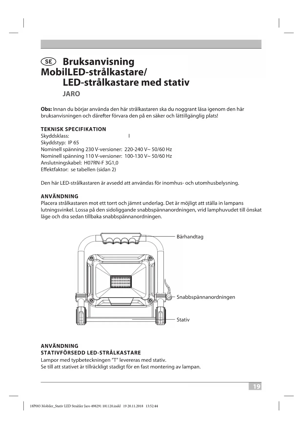 Lampor med typbeteckningen ”T” levereras med stativ. Se till att stativet är tillräckligt stadigt för en fast montering av lampan. 18P083 Mobiler_Stativ LED Strahler Jaro 498291 181120.indd 19 20.11.2018 13:52:4420