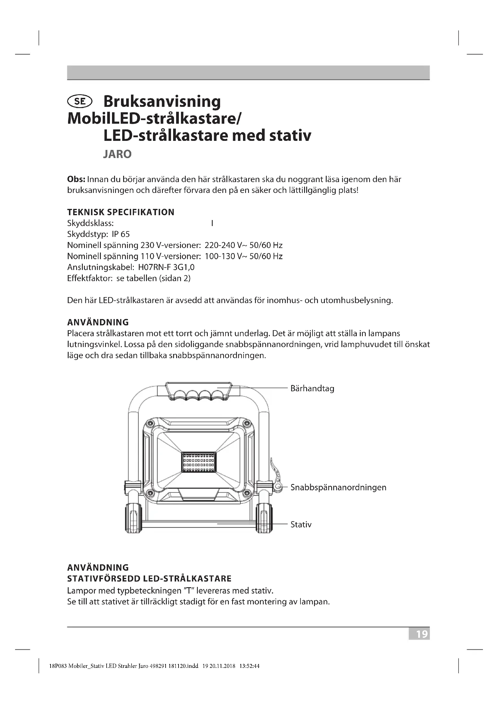 Lampor med typbeteckningen ”T” levereras med stativ. Se till att stativet är tillräckligt stadigt för en fast montering av lampan. 18P083 Mobiler_Stativ LED Strahler Jaro 498291 181120.indd 19 20.11.2018 13:52:4420