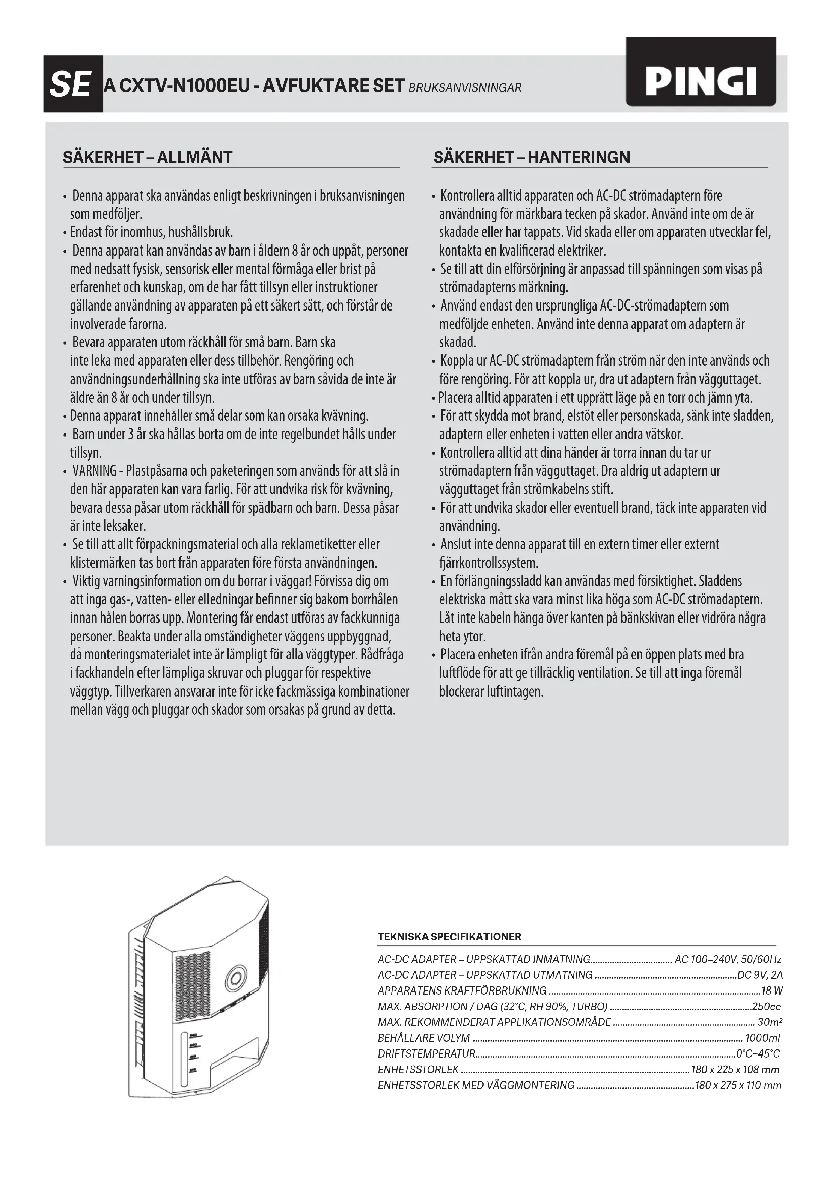 CXTV-N1000EU - VIDA SE (2020)_v1.indd 3 06-11-20(W45) 16:07ANVÄNDNINGSOMRÅDENDitt nya Pingi Vida Avfuktarset (CXTV-N1000EU) är lämpligt för avfuktning av slutna inomhusutrymmen. Apparaten drivs av 9V AC-DC-adaptern som levereras med enheten. Strömadaptern fungerar på 100-240V, 50/60Hz (elnät). Försök aldrig ansluta enheten eller strömadaptern till andra strömkällor. Följ alltid säkerhetsanvisningarna i denna bruksanvisning. Bevara denna bruksanvisning på en säker plats så att den alltid är tillgänglig. Denna produkt följer regelverk, nationella och europeiska krav. Försök aldrig utföra tekniska modifikationer på den här enheten. Vi tar inte ansvar för olyckor eller skador som uppstår från misslyckande av att följa dessa bruks-och säkerhetsanvisningar.FUNKTION OCH ANVÄNDNING Pingi Vida Avfuktarset (CXTV-N1000EU) utvecklades som ett kompakt avfuktningsset som fångar överskott av fukt i inomhusutrymmen. Denna produkt är idealiskt anpassad för oventilerade inomhusutrymmen. Den fångade fukten samlas i den integrerade behållaren.VAD DU KAN FÖRVÄNTAVida 2 är en termoelektrisk avfuktare. Prestandan för denna typ av avfuktare beror på mängden vatten i luften. Ju högre lufttemperaturen är, desto mer vattenluft kan den behärska (relativ fuktighet). Vid höga rumstemperaturer måste enheten arbeta mycket hårdare och den måste ta bort mer fukt för att minska den relativa luftfuktighetsnivån. Vida 2 samlar sedan upp till 250ml vatten per dag och du kan ofta behöva tömma vattentanken. I ett kallare rum blir det mindre vatten att fånga och tanken fylls långsammare. Är rumstemperatur <10°C? Då kommer det inte att finnas mycket fukt i luften och tanken kommer att fyllas väldigt långsamt.INNAN DU BÖRJARLäs noga igenom säkerhetsanvisningarna på framsidan av denna bruksanvisning innan du börjar.VÄGGMONTERING INSTALLATION Detta set levereras med ett inkluderat väggfäste, modell VSB-1S. Användning av väggmontering är valfri – apparaten kan även användas utan den. För att säkert kunna använda väggmonteringen måste montern monteras fast säkert på en vertikal yta med hjälp av 3 skruvar. 1. Välj en vertikal yta som tillhandahåller tillräckligt med avstånd till väggmonteringen och andra föremål.