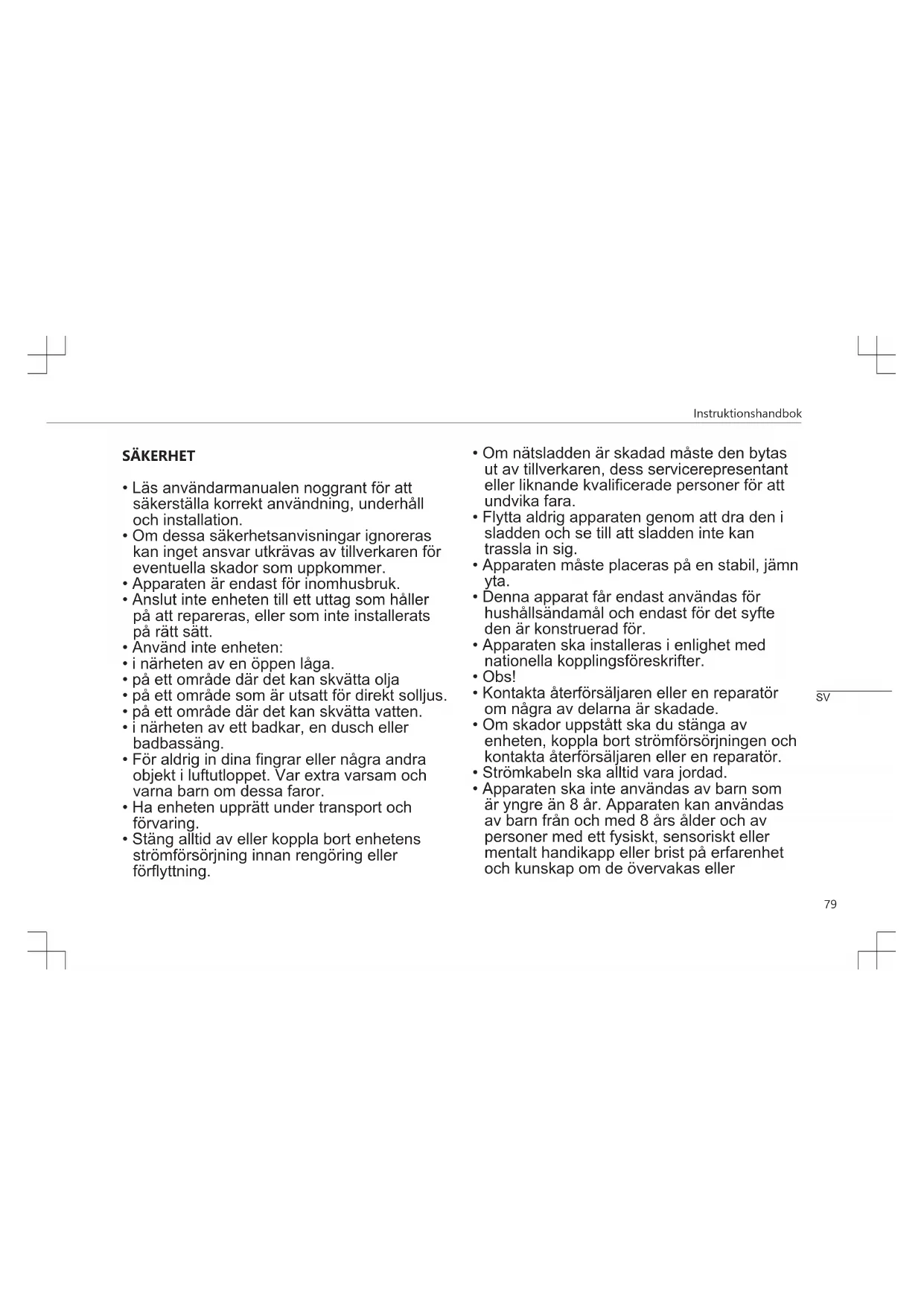 - Apparaten ska inte användas av barn som är yngre än 8 år. Apparaten kan användas av barn från och med 8 års ålder och av personer med ett fysiskt, sensoriskt eller mentalt handikapp eller brist på erfarenhet och kunskap om de övervakas eller SVInstruktionshandbok