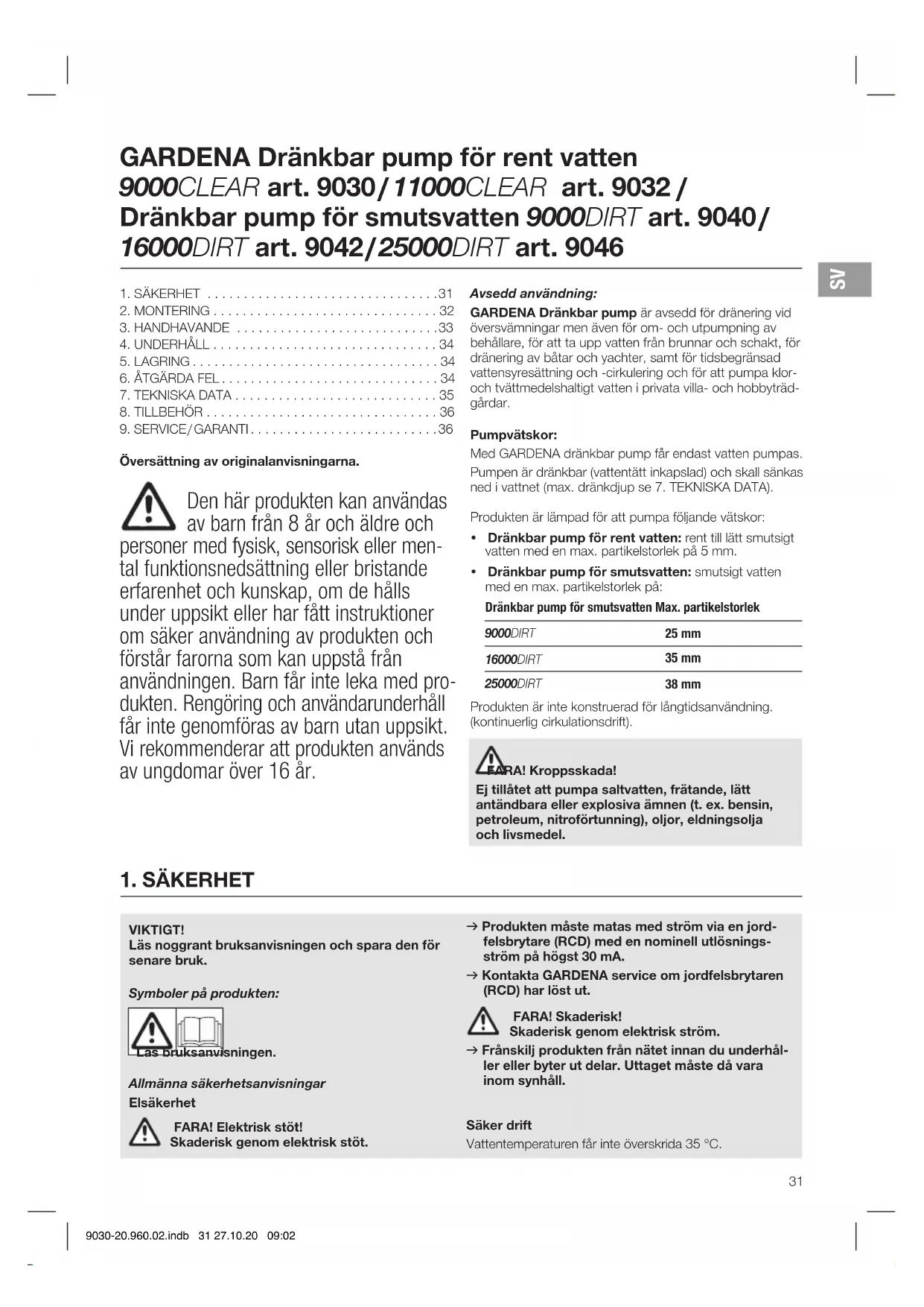 VIKTIGT! Läs noggrant bruksanvisningen och spara den för senare bruk. Symboler på produkten: Läs bruksanvisningen. Allmänna säkerhetsanvisningar Elsäkerhet FARA! Elektrisk stöt! Skaderisk genom elektrisk stöt. v Produkten måste matas med ström via en jord- felsbrytare (RCD) med en nominell utlösnings- ström på högst 30 mA. v Kontakta GARDENA service om jordfelsbrytaren (RCD) har löst ut. FARA! Skaderisk! Skaderisk genom elektrisk ström. v Frånskilj produkten från nätet innan du underhål- ler eller byter ut delar. Uttaget måste då vara inom synhåll. Säker drift Vattentemperaturen får inte överskrida 35 °C. GARDENA Dränkbar pump för rent vatten 9000CLEAR art. 9030 / 11000CLEAR art. 9032 / Dränkbar pump för smutsvatten 9000DIRT art. 9040 / 16000DIRT art. 9042 / 25000DIRT art. 9046