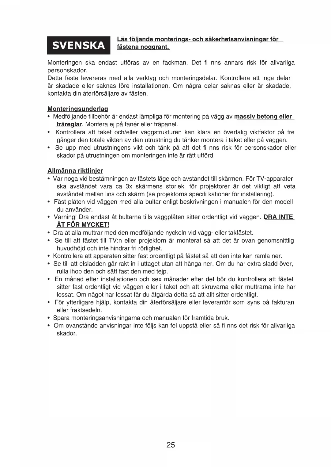 - Kontrollera att taket och/eller väggstrukturen kan klara en övertalig viktfaktor på tre gånger den totala vikten av den utrustning du tänker montera i taket eller på väggen.