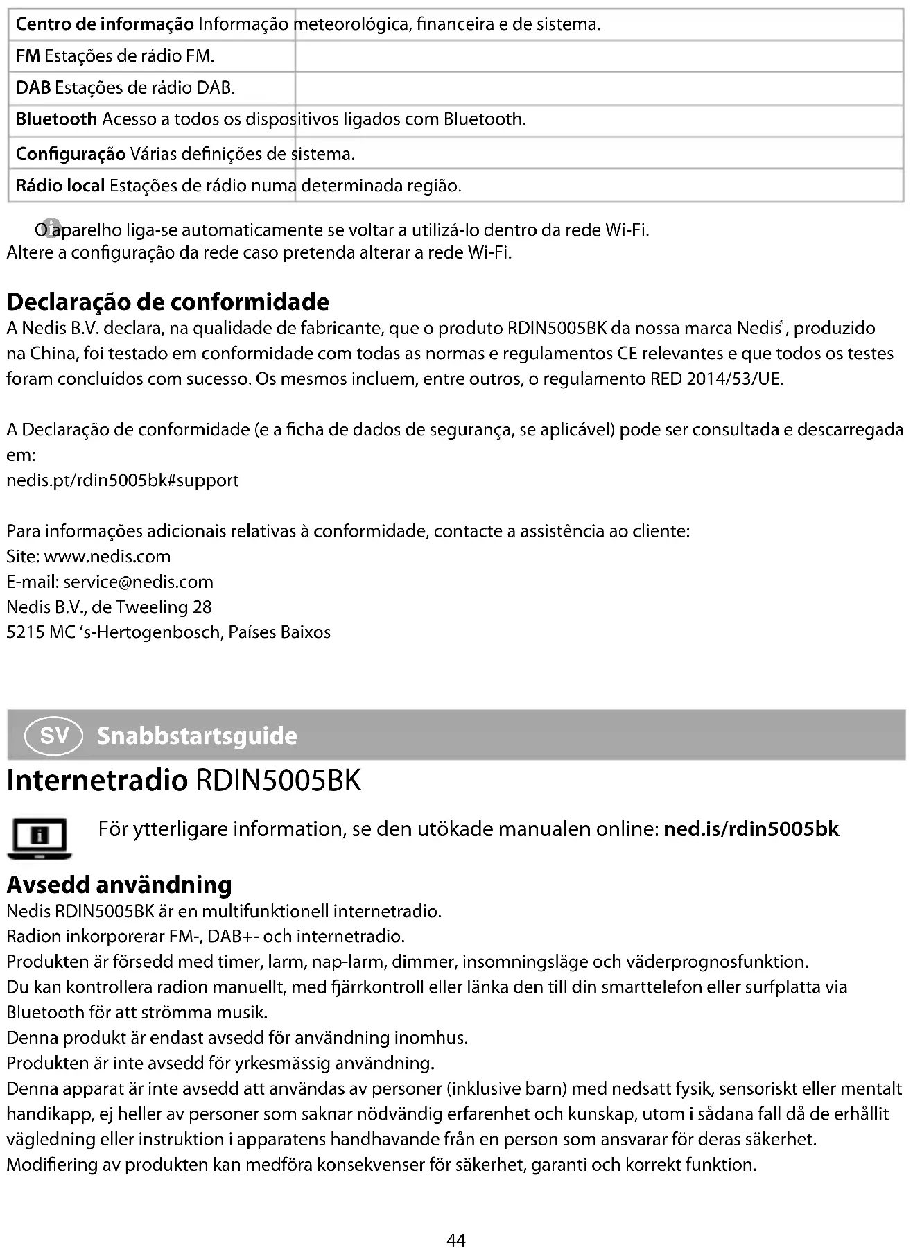 Snabbstartsguide Internetradio RDIN5005BK För ytterligare information, se den utökade manualen online: ned.is/rdin5005bk Avsedd användning Nedis RDIN5005BK är en multifunktionell internetradio.Radion inkorporerar FM-, DAB+- och internetradio.Produkten är försedd med timer, larm, nap-larm, dimmer, insomningsläge och väderprognosfunktion.Du kan kontrollera radion manuellt, med ärrkontroll eller länka den till din smarttelefon eller surfplatta via Bluetooth för att strömma musik.Denna produkt är endast avsedd för användning inomhus.Produkten är inte avsedd för yrkesmässig användning.Denna apparat är inte avsedd att användas av personer (inklusive barn) med nedsatt fysik, sensoriskt eller mentalt handikapp, ej heller av personer som saknar nödvändig erfarenhet och kunskap, utom i sådana fall då de erhållit vägledning eller instruktion i apparatens handhavande från en person som ansvarar för deras säkerhet.Modifiering av produkten kan medföra konsekvenser för säkerhet, garanti och korrekt funktion.45 Specikationer Produkt Internetradio Artikelnummer RDIN5005BK Dimensioner (b x h x d) 255 x 180 x 105 mm Vikt 1,4 kg Kraftingång 100 - 240 V Trådlös förbindelse Wi-Fi / Bluetooth