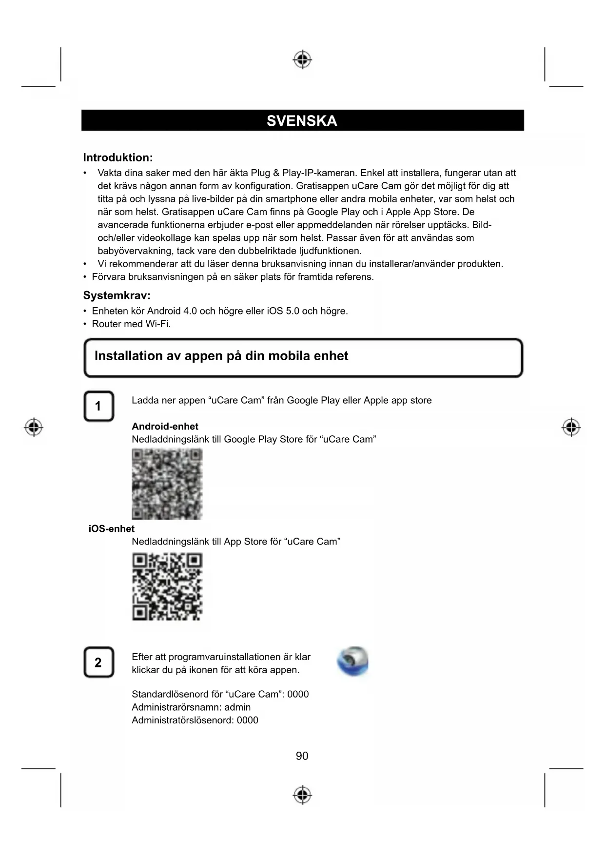 Standardlösenord för “uCare Cam”: 0000 Administrarörsnamn: admin Administratörslösenord: 0000