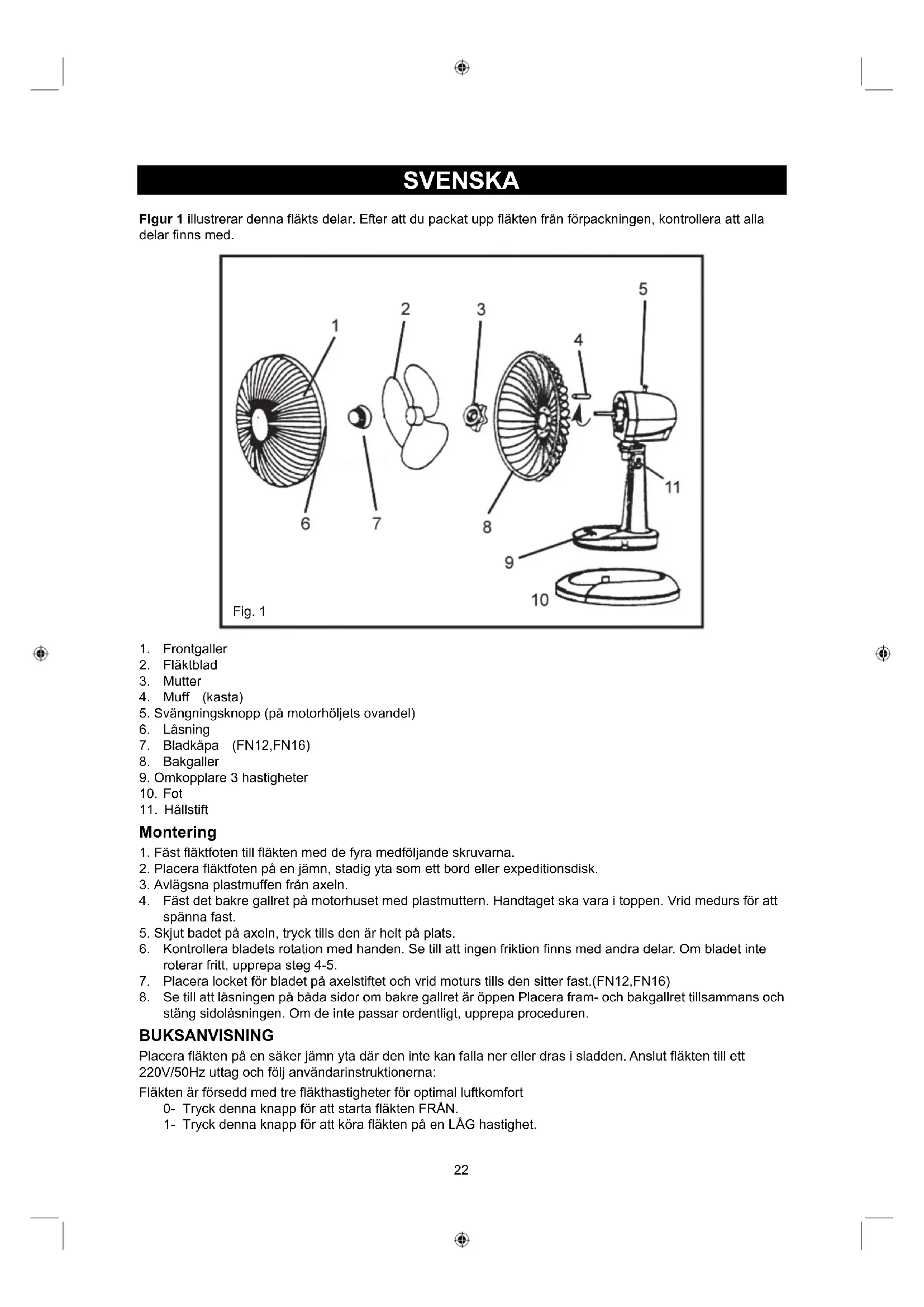 stäng sidolåsningen. Om de inte passar ordentligt, upprepa proceduren. BUKSANVISNING Placera fläkten på en säker jämn yta där den inte kan falla ner eller dras i sladden. Anslut fläkten till ett 220V/50Hz uttag och följ användarinstruktionerna: Fläkten är försedd med tre fläkthastigheter för optimal luftkomfort