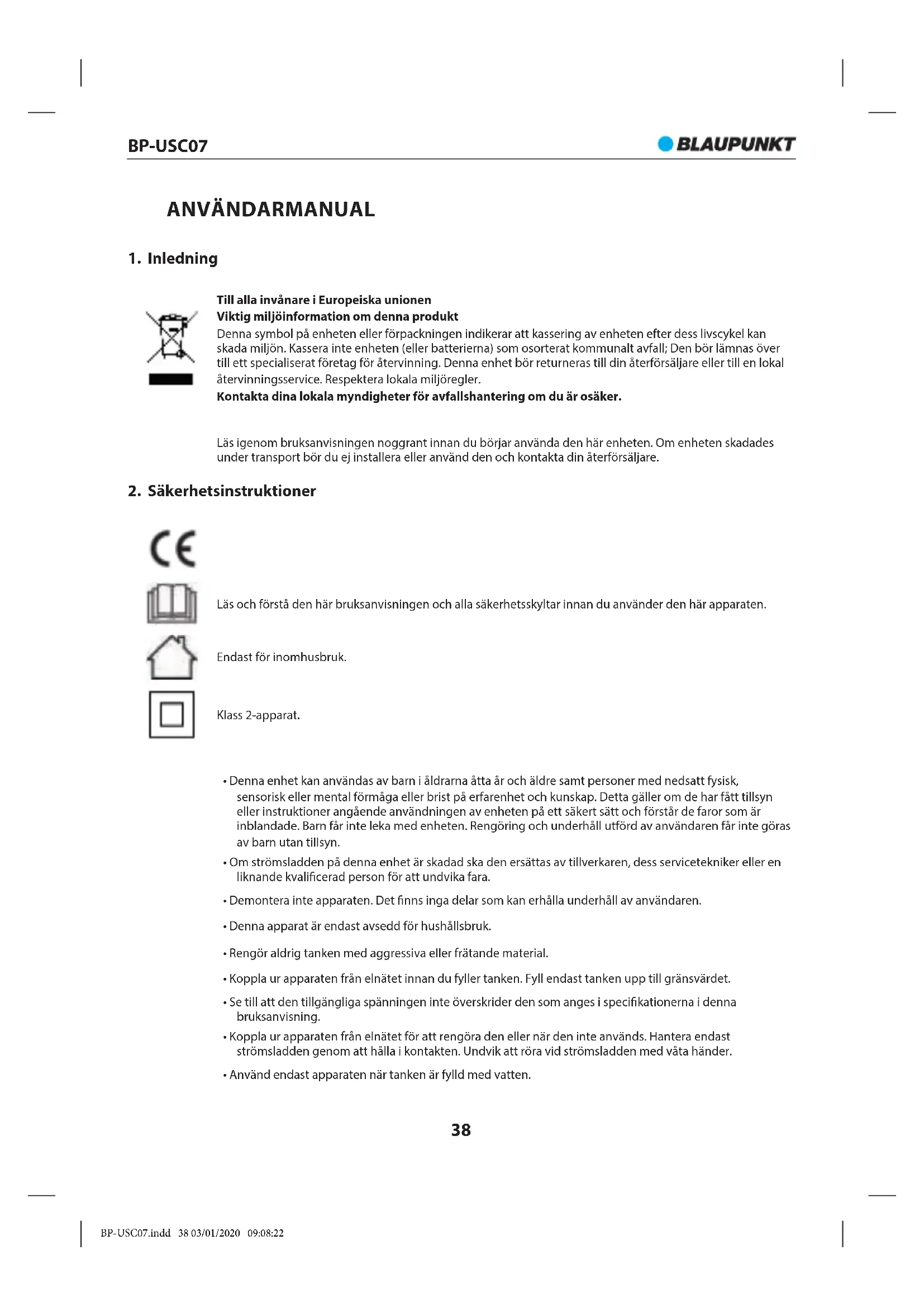 - Använd endast apparaten när tanken är fylld med vatten. BP-USC07.indd 38 03/01/2020 09:08:22BP-USC07