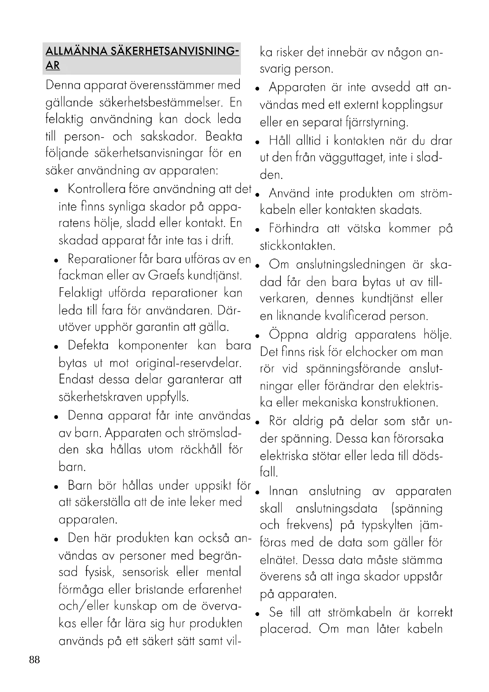Denna apparat överensstämmer med gällande säkerhetsbestämmelser. En felaktig användning kan dock leda till person- och sakskador. Beakta följande säkerhetsanvisningar för en säker användning av apparaten: ● Kontrollera före användning att det inte finns synliga skador på appa- ratens hölje, sladd eller kontakt. En skadad apparat får inte tas i drift. ● Reparationer får bara utföras av en fackman eller av Graefs kundtjänst. Felaktigt utförda reparationer kan leda till fara för användaren. Där- utöver upphör garantin att gälla. ● Defekta komponenter kan bara bytas ut mot original-reservdelar. Endast dessa delar garanterar att säkerhetskraven uppfylls. ● Denna apparat får inte användas av barn. Apparaten och strömslad- den ska hållas utom räckhåll för barn. ● Barn bör hållas under uppsikt för att säkerställa att de inte leker med apparaten. ● Den här produkten kan också an- vändas av personer med begrän- sad fysisk, sensorisk eller mental förmåga eller bristande erfarenhet och/eller kunskap om de överva- kas eller får lära sig hur produkten används på ett säkert sätt samt vil- ka risker det innebär av någon an- svarig person. ● Apparaten är inte avsedd att an- vändas med ett externt kopplingsur eller en separat fjärrstyrning. ● Håll alltid i kontakten när du drar ut den från vägguttaget, inte i slad- den. ● Använd inte produkten om ström- kabeln eller kontakten skadats. ● Förhindra att vätska kommer på stickkontakten. ● Om anslutningsledningen är ska- dad får den bara bytas ut av till- verkaren, dennes kundtjänst eller en liknande kvalificerad person. ● Öppna aldrig apparatens hölje. Det finns risk för elchocker om man rör vid spänningsförande anslut- ningar eller förändrar den elektris- ka eller mekaniska konstruktionen. ● Rör aldrig på delar som står un- der spänning. Dessa kan förorsaka elektriska stötar eller leda till döds- fall. ● Innan anslutning av apparaten skall anslutningsdata (spänning och frekvens) på typskylten jäm- föras med de data som gäller för elnätet. Dessa data måste stämma överens så att inga skador uppstår på apparaten. ● Se till att strömkabeln är korrekt placerad. Om man låter kabeln89