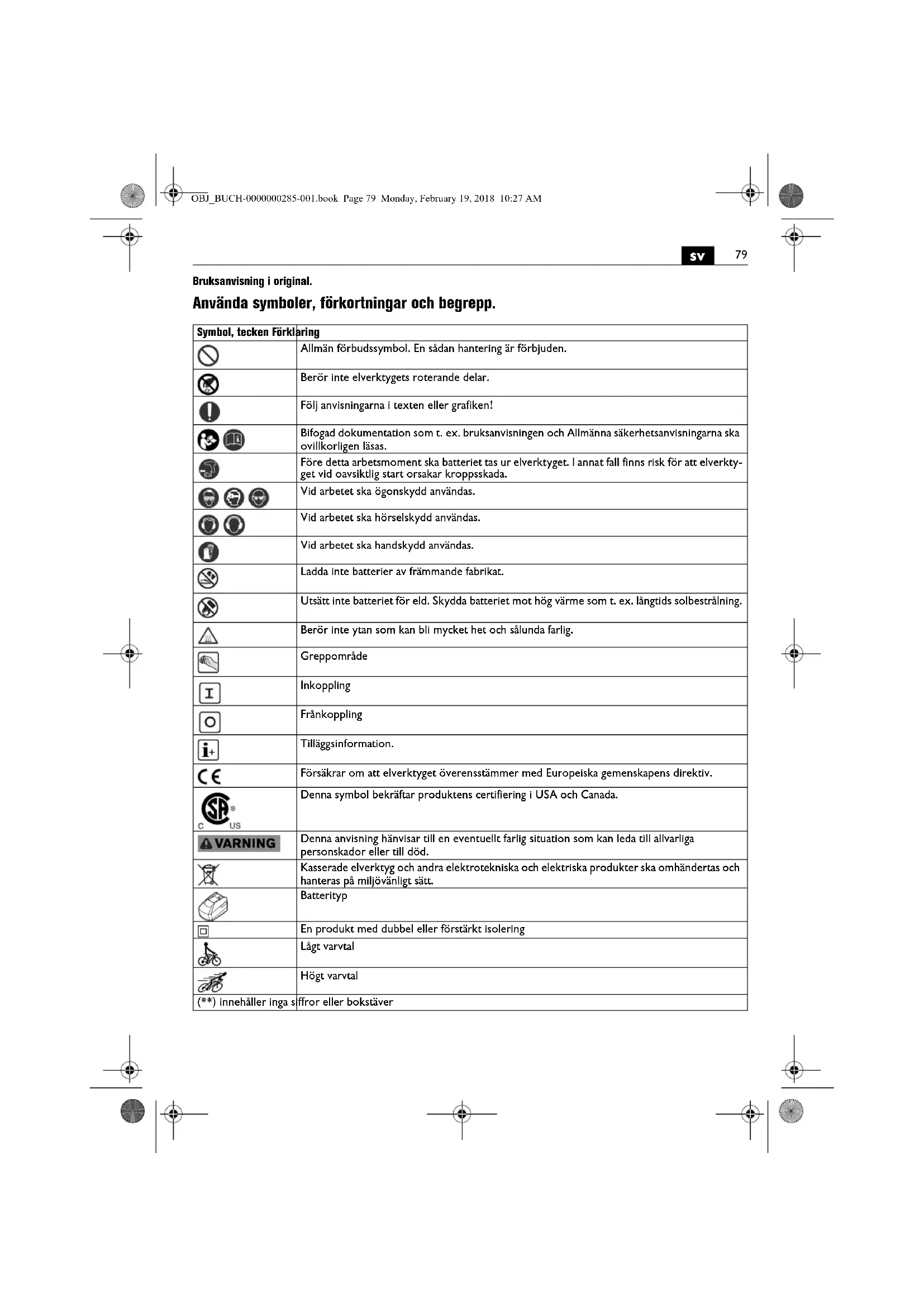 Bruksanvisning i original. Använda symboler, förkortningar och begrepp. Symbol, tecken Förklaring Allmän förbudssymbol. En sådan hantering är förbjuden. Berör inte elverktygets roterande delar. Följ anvisningarna i texten eller grafiken! Bifogad dokumentation som t. ex. bruksanvisningen och Allmänna säkerhetsanvisningarna ska ovillkorligen läsas. Före detta arbetsmoment ska batteriet tas ur elverktyget. I annat fall finns risk för att elverkty- get vid oavsiktlig start orsakar kroppsskada. Vid arbetet ska ögonskydd användas. Vid arbetet ska hörselskydd användas. Vid arbetet ska handskydd användas. Ladda inte batterier av främmande fabrikat. Utsätt inte batteriet för eld. Skydda batteriet mot hög värme som t. ex. långtids solbestrålning. Berör inte ytan som kan bli mycket het och sålunda farlig. Greppområde Inkoppling Frånkoppling Tilläggsinformation. Försäkrar om att elverktyget överensstämmer med Europeiska gemenskapens direktiv. Denna symbol bekräftar produktens certifiering i USA och Canada. Denna anvisning hänvisar till en eventuellt farlig situation som kan leda till allvarliga personskador eller till död. Kasserade elverktyg och andra elektrotekniska och elektriska produkter ska omhändertas och hanteras på miljövänligt sätt. Batterityp En produkt med dubbel eller förstärkt isolering Lågt varvtal Högt varvtal (**) innehåller inga siffror eller bokstäver OBJ_BUCH-0000000285-001.book Page 79 Monday, February 19, 2018 10:27 AM80