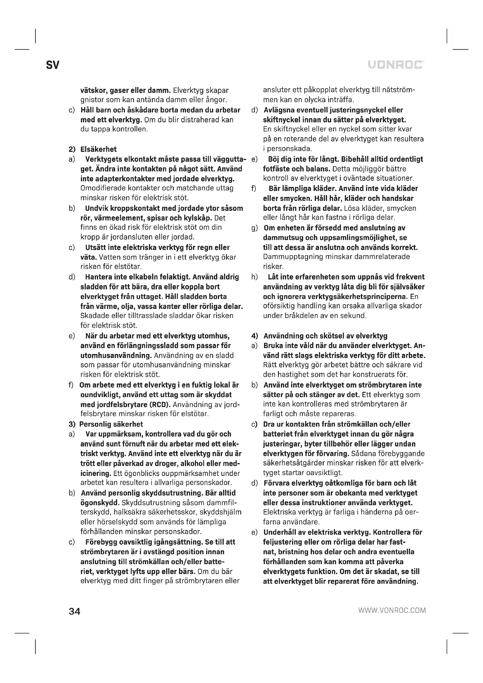a) Håll arbetsplatsen ren och välbelyst. Belamrade eller mörka områden inbjuder till olyckor. b) Använd inte elektriska verktyg i explosiva atmosfärer, såsom i närvaro av lättantändliga34