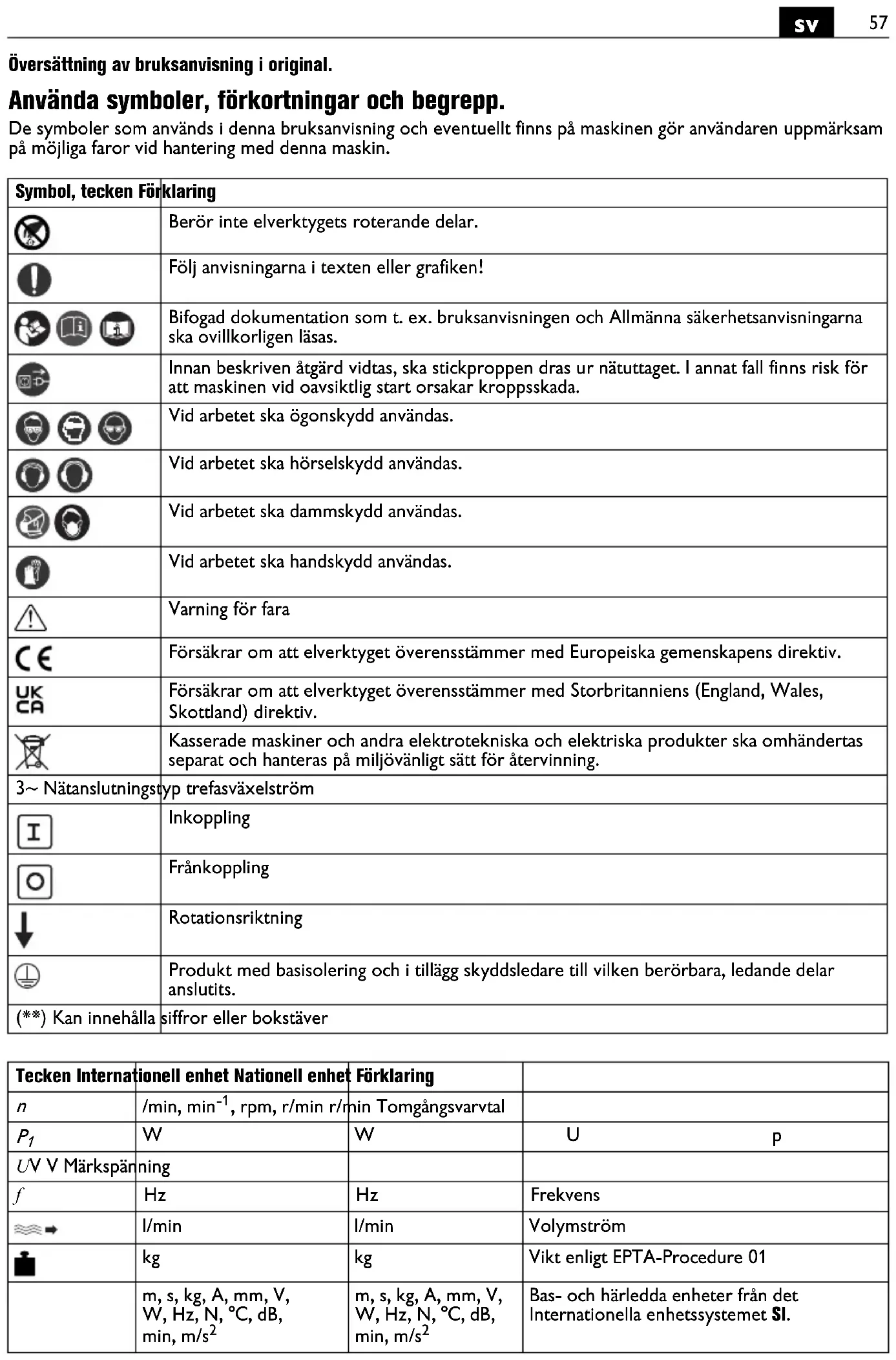 Översättning av bruksanvisning i original. Använda symboler, förkortningar och begrepp. De symboler som används i denna bruksanvisning och eventuellt finns på maskinen gör användaren uppmärksam på möjliga faror vid hantering med denna maskin. Symbol, tecken Förklaring Berör inte elverktygets roterande delar. Följ anvisningarna i texten eller grafiken! Bifogad dokumentation som t. ex. bruksanvisningen och Allmänna säkerhetsanvisningarna ska ovillkorligen läsas. Innan beskriven åtgärd vidtas, ska stickproppen dras ur nätuttaget. I annat fall finns risk för att maskinen vid oavsiktlig start orsakar kroppsskada. Vid arbetet ska ögonskydd användas. Vid arbetet ska hörselskydd användas. Vid arbetet ska dammskydd användas. Vid arbetet ska handskydd användas. Varning för fara Försäkrar om att elverktyget överensstämmer med Europeiska gemenskapens direktiv. Försäkrar om att elverktyget överensstämmer med Storbritanniens (England, Wales, Skottland) direktiv. Kasserade maskiner och andra elektrotekniska och elektriska produkter ska omhändertas separat och hanteras på miljövänligt sätt för återvinning. 3~ Nätanslutningstyp trefasväxelström Inkoppling Frånkoppling Rotationsriktning Produkt med basisolering och i tillägg skyddsledare till vilken berörbara, ledande delar anslutits. (**) Kan innehålla siffror eller bokstäver Tecken Internationell enhet Nationell enhet Förklaring