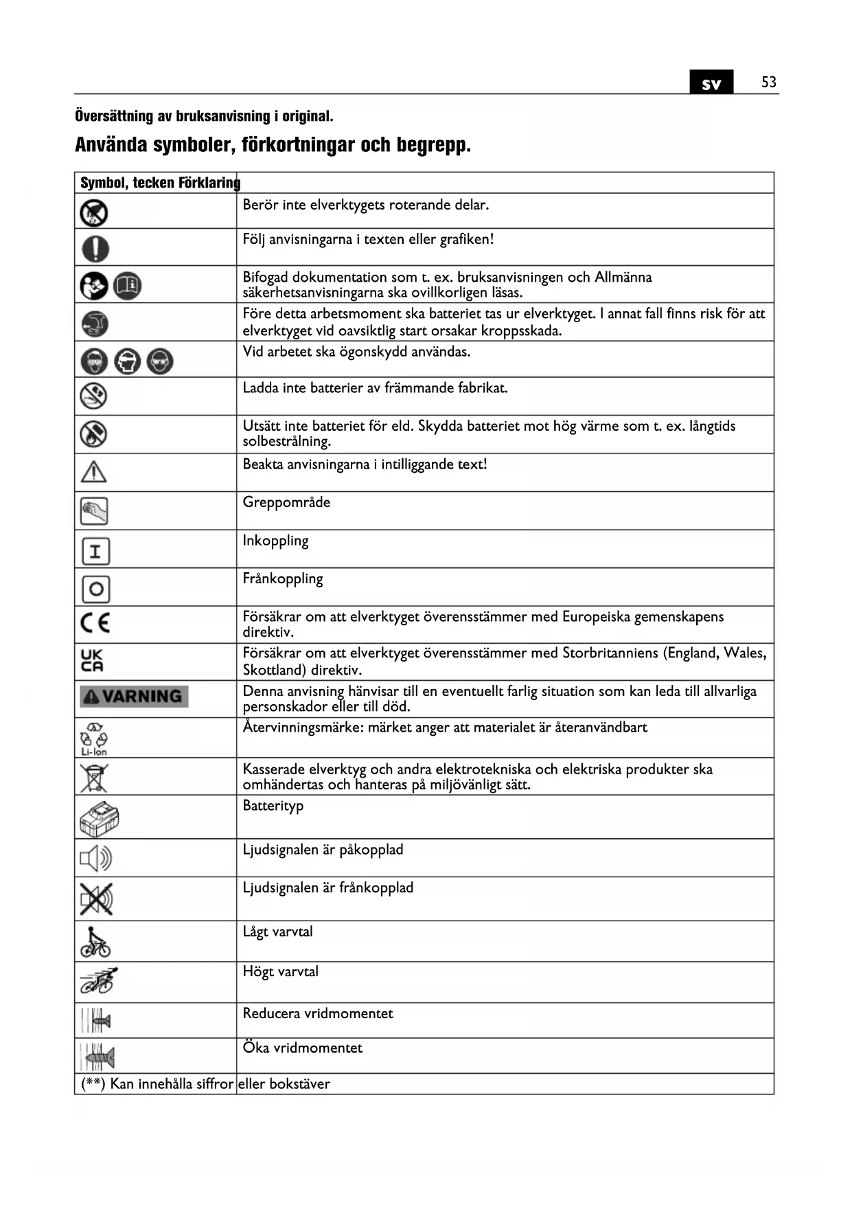 För din säkerhet. Läs noga igenom alla säkerhetsan- visningar och instruktioner. Fel som uppstår till följd av att säkerhetsanvisningarna och instruktionerna inte följts kan orsaka elstöt, brand och/eller allvarliga personskador. Förvara alla varningar och anvisningar för framtida bruk. Använd inte detta elverktyg innan du noggrant läst och fullständigt förstått denna instruktions- bok samt bifogade „Allmänna säkerhetsanvis- ningar“ (publikationsnummer 3 41 30 465 06 0). Dessa underlag bör förvaras för senare användning och ska bifogas elverktyget vid överlåtelse eller försäljning. Beakta även tillämpliga nationella arbetarskyddsbestäm- melser. Avsedd användning av elverktyget: handhållen skruvdragare för i- och urdragning av skru- var med av FEIN godkända insatsverktyg och tillbehör i väderskyddad omgivning, speciellt lämplig för självbor- rande och självgängade skruvar. Speciella säkerhetsanvisningar. Håll i elverktyget endast vid de isolerade greppytorna när arbeten utförs på ställen där skruven kan skada dolda elledningar. Kontakt med en spänningsförande ledning kan sätta elverktygets metalldelar under spän- ning och leda till elstöt. Se upp för dolt liggande elledningar, gas- och vattenrör. Kontrollera arbetsområdet t. ex. med en metalldetek- tor innan arbetet påbörjas. Säkra arbetsstycket. Arbetsstycket ligger säkrare i en uppspänningsanordning än i handen. Håll stadigt tag i elverktyget. Höga reaktionsmoment kan kortvarigt uppstå. Magnesiumhaltigt material får inte bearbetas. Det finns risk för brand. Bearbeta inte CFK (kolfiberarmerad plast) eller asbest- haltigt material. Dessa ämnen anses vara canceral- strande. Det är förbjudet att med skruvar eller nitar fästa brickor och märken på elverktyget. En skadad isolering skyddar inte längre mot elstöt. Använd dekaler. Använd endast tillbehör som speciellt tagits fram eller godkänts av elverktygets tillverkare. Användningen behöver inte vara säker bara för att tillbehöret passar till elverktyget. Användning och hantering av batterier (batterimoduler). För undvikande av faror som t. ex. brandskador, explo- sion, hudskador och andra personskador vid hantering med batterierna ska följande anvisningar följas: Batterierna får inte tas isär och inte heller krossas. Utsätt inte batterierna för mekaniska stötar. Ett skadat eller felanvänt batteri kan orsaka hälsovådliga ångor och vätskor. Ångorna kan leda till irritation i andningsvägar- na. Batterivätskan kan medföra hudirritation eller brännskada. Om batterivätskan vätt intilliggande föremål, kontrol- lera berörda delar, rengör eller byt dem vid behov. Utsätt inte batteriet för hetta eller eld. Låt inte batteriet ligga i solljus. Plocka upp batteriet ur originalförpackningen först när det ska användas. Tecken Internationell enhet Nationell enhet Förklaring U V V Elektrisk likspänning