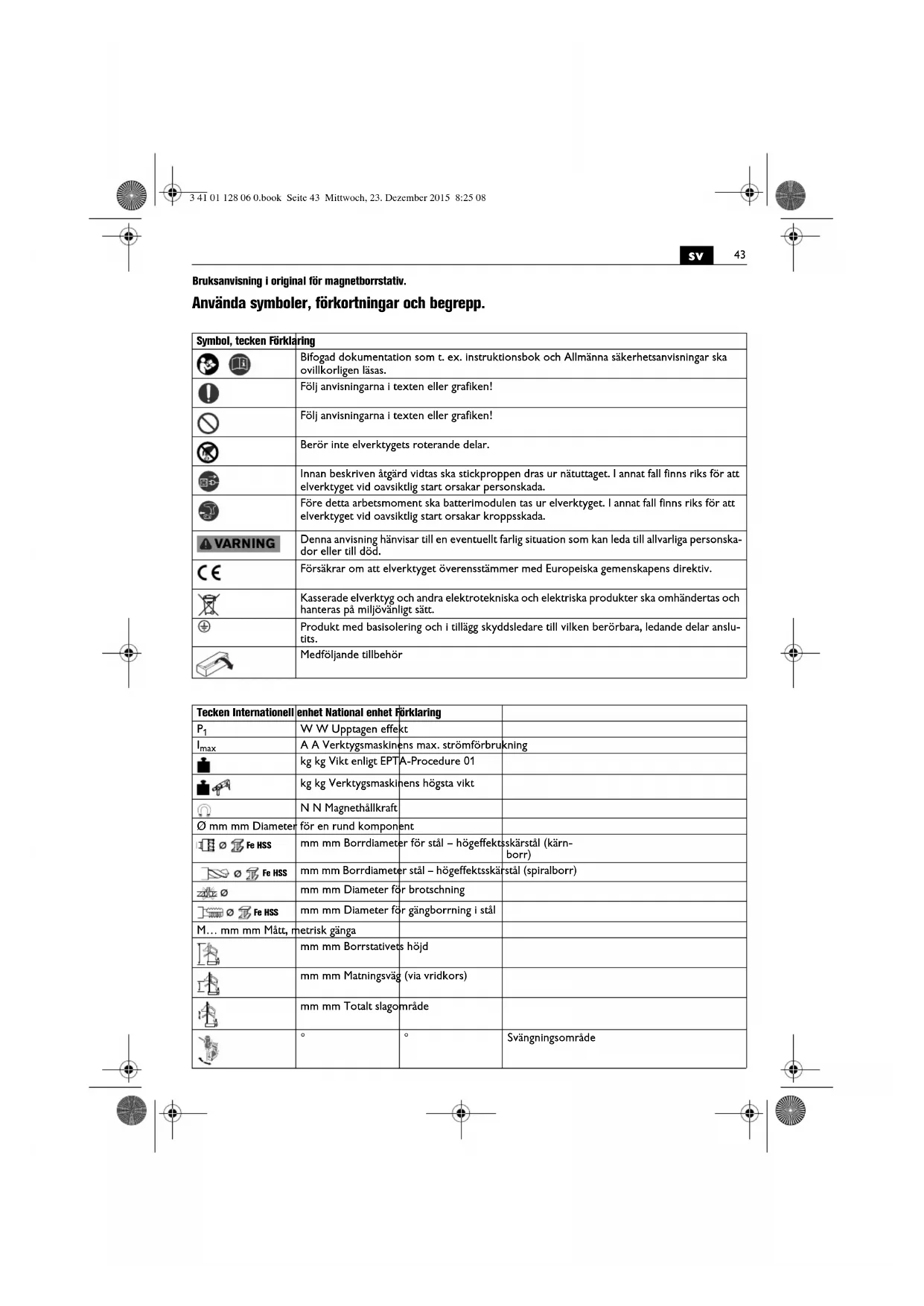 Bruksanvisning i original för magnetborrstativ. Använda symboler, förkortningar och begrepp. Symbol, tecken Förklaring Bifogad dokumentation som t. ex. instruktionsbok och Allmänna säkerhetsanvisningar ska ovillkorligen läsas. Följ anvisningarna i texten eller grafiken! Följ anvisningarna i texten eller grafiken! Berör inte elverktygets roterande delar. Innan beskriven åtgärd vidtas ska stickproppen dras ur nätuttaget. I annat fall finns riks för att elverktyget vid oavsiktlig start orsakar personskada. Före detta arbetsmoment ska batterimodulen tas ur elverktyget. I annat fall finns riks för att elverktyget vid oavsiktlig start orsakar kroppsskada. Denna anvisning hänvisar till en eventuellt farlig situation som kan leda till allvarliga personska- dor eller till död. Försäkrar om att elverktyget överensstämmer med Europeiska gemenskapens direktiv. Kasserade elverktyg och andra elektrotekniska och elektriska produkter ska omhändertas och hanteras på miljövänligt sätt. Produkt med basisolering och i tillägg skyddsledare till vilken berörbara, ledande delar anslu- tits. Medföljande tillbehör Tecken Internationell enhet National enhet Förklaring
