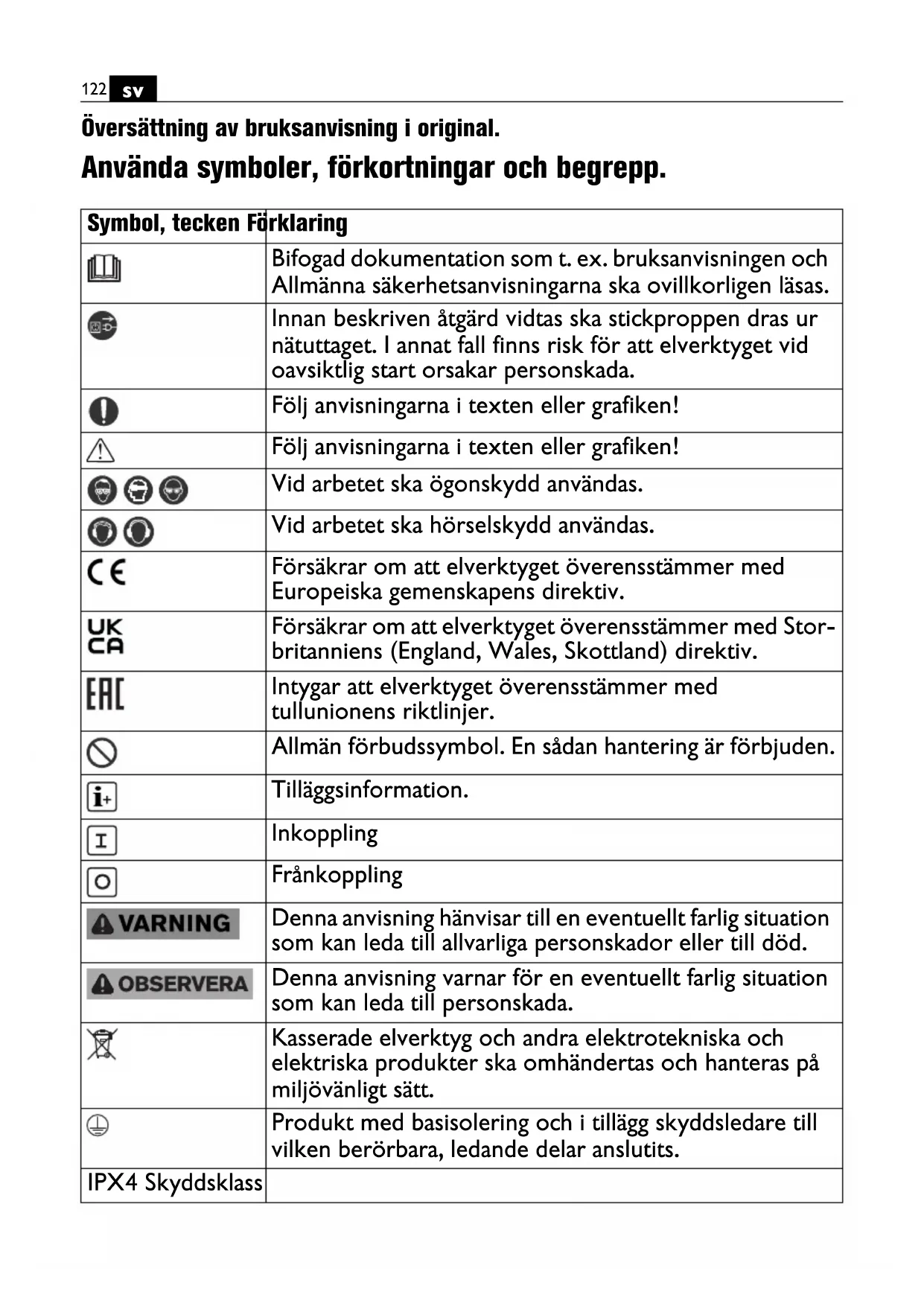Översättning av bruksanvisning i original. Använda symboler, förkortningar och begrepp. Symbol, tecken Förklaring Bifogad dokumentation som t. ex. bruksanvisningen och Allmänna säkerhetsanvisningarna ska ovillkorligen läsas. Innan beskriven åtgärd vidtas ska stickproppen dras ur nätuttaget. I annat fall finns risk för att elverktyget vid oavsiktlig start orsakar personskada. Följ anvisningarna i texten eller grafiken! Följ anvisningarna i texten eller grafiken! Vid arbetet ska ögonskydd användas. Vid arbetet ska hörselskydd användas. Försäkrar om att elverktyget överensstämmer med Europeiska gemenskapens direktiv. Försäkrar om att elverktyget överensstämmer med Stor- britanniens (England, Wales, Skottland) direktiv. Intygar att elverktyget överensstämmer med tullunionens riktlinjer. Allmän förbudssymbol. En sådan hantering är förbjuden. Tilläggsinformation. Inkoppling Frånkoppling Denna anvisning hänvisar till en eventuellt farlig situation som kan leda till allvarliga personskador eller till död. Denna anvisning varnar för en eventuellt farlig situation som kan leda till personskada. Kasserade elverktyg och andra elektrotekniska och elektriska produkter ska omhändertas och hanteras på miljövänligt sätt. Produkt med basisolering och i tillägg skyddsledare till vilken berörbara, ledande delar anslutits. IPX4 Skyddsklass123
