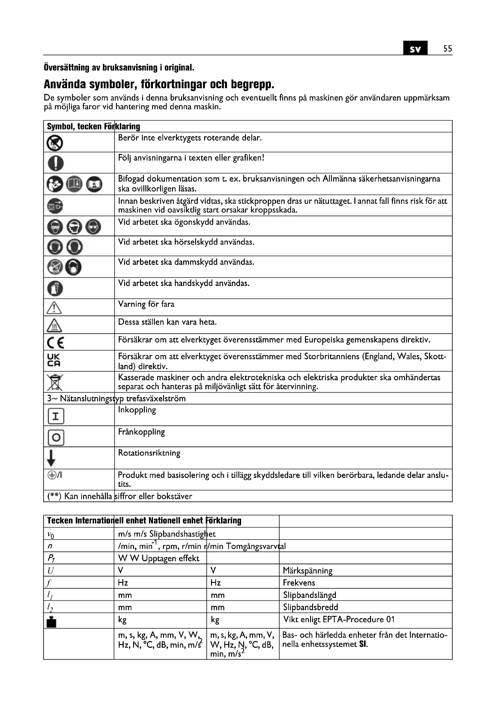 Översättning av bruksanvisning i original. Använda symboler, förkortningar och begrepp. De symboler som används i denna bruksanvisning och eventuellt finns på maskinen gör användaren uppmärksam på möjliga faror vid hantering med denna maskin. Symbol, tecken Förklaring Berör inte elverktygets roterande delar. Följ anvisningarna i texten eller grafiken! Bifogad dokumentation som t. ex. bruksanvisningen och Allmänna säkerhetsanvisningarna ska ovillkorligen läsas. Innan beskriven åtgärd vidtas, ska stickproppen dras ur nätuttaget. I annat fall finns risk för att maskinen vid oavsiktlig start orsakar kroppsskada. Vid arbetet ska ögonskydd användas. Vid arbetet ska hörselskydd användas. Vid arbetet ska dammskydd användas. Vid arbetet ska handskydd användas. Varning för fara Dessa ställen kan vara heta. Försäkrar om att elverktyget överensstämmer med Europeiska gemenskapens direktiv. Försäkrar om att elverktyget överensstämmer med Storbritanniens (England, Wales, Skott- land) direktiv. Kasserade maskiner och andra elektrotekniska och elektriska produkter ska omhändertas separat och hanteras på miljövänligt sätt för återvinning. 3~ Nätanslutningstyp trefasväxelström Inkoppling Frånkoppling Rotationsriktning /I Produkt med basisolering och i tillägg skyddsledare till vilken berörbara, ledande delar anslu- tits. (**) Kan innehålla siffror eller bokstäver Tecken Internationell enhet Nationell enhet Förklaring