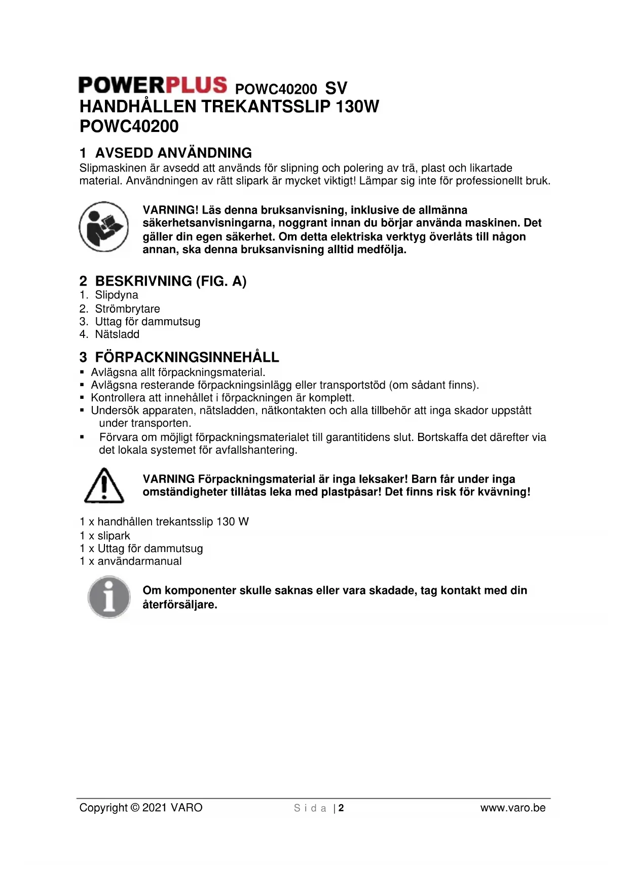 VARNING Förpackningsmaterial ar inga leksaker! Barn fär under inga omständigheter tillatas leka med plastpäsar! Det finns risk for kvävning!
