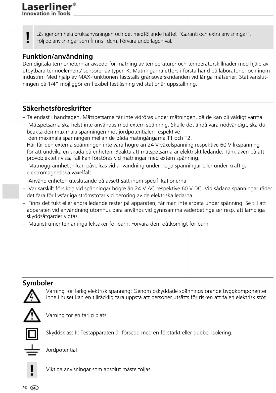 Den digitala termometern är avsedd för mätning av temperaturer och temperaturskillnader med hjälp av utbytbara termoelement/-sensorer av typen K. Mätningarna utförs i första hand på laboratorier och inom industrin. Med hjälp av MAX-funktionen fastställs gränsöverskridanden vid långa mätserier. Stativanslut- ningen på 1/4“ möjliggör en fl exibel fastlåsning vid stationär uppställning. Funktion/användning – Ta endast i handtagen. Mätspetsarna får inte vidröras under mätningen, då de kan bli väldigt varma. – Mätspetsarna ska helst inte användas med extern spänning. Skulle det ändå vara nödvändigt, ska du beakta den maximala spänningen mot jordpotentialen respektive den maximala spänningen mellan de båda mätingångarna T1 och T2. Här får den externa spänningen inte vara högre än 24 V växelspänning respektive 60 V likspänning för att undvika en skada på enheten. Beakta att mätspetsarna är elektriskt ledande. Tänk även på att provobjektet i vissa fall kan förstöras vid mätningar med extern spänning. – Mätnoggrannheten kan påverkas vid användning under höga spänningar eller under kraftiga elektromagnetiska växelfält. Säkerhetsföreskrifter Skyddsklass II: Testapparaten är försedd med en förstärkt eller dubbel isolering. Jordpotential Viktiga anvisningar som absolut måste följas. Symboler Varning för farlig elektrisk spänning: Genom oskyddade spänningsförande byggkomponenter inne i huset kan en tillräcklig fara uppstå att personer utsätts för risken att få en elektrisk stöt. Varning för en farlig plats