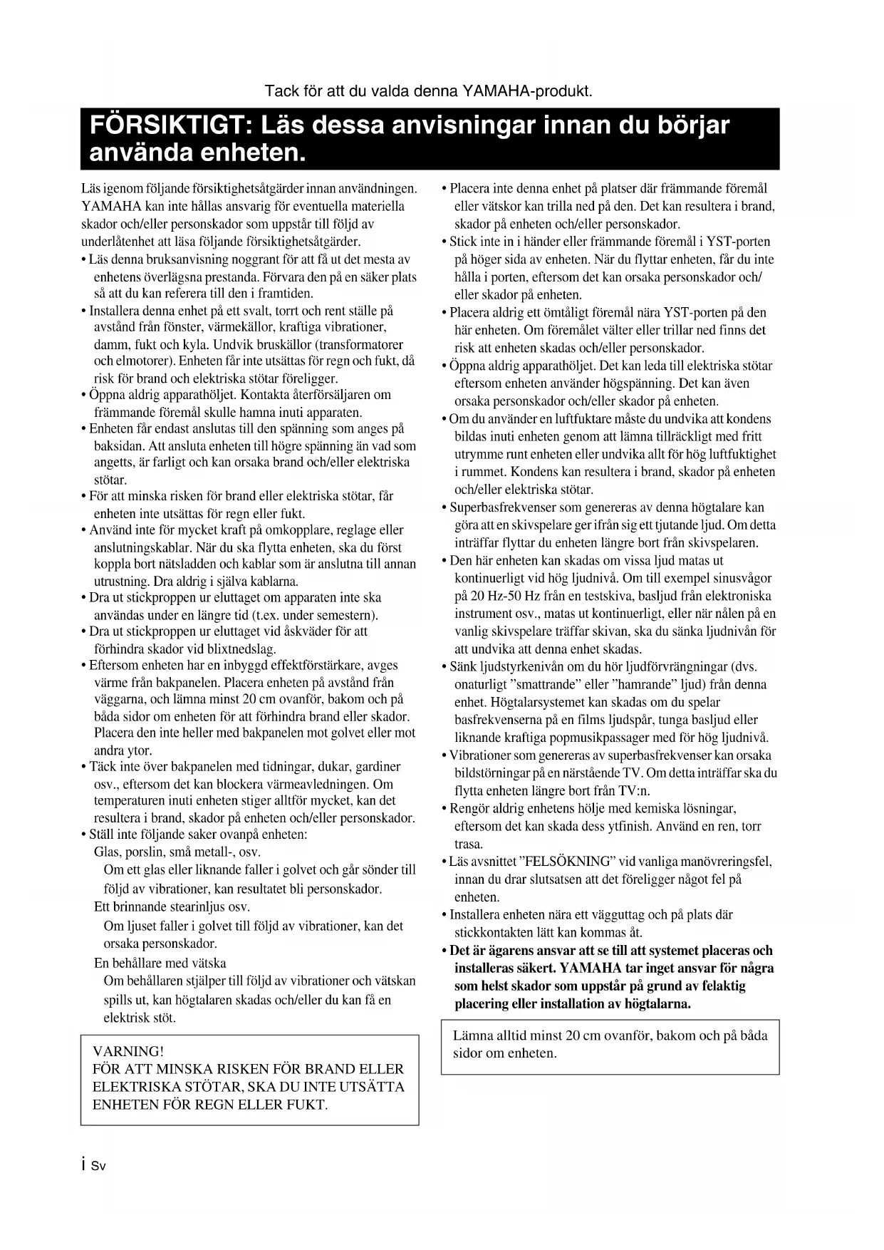 - Det är ägarens ansvar att se till att systemet placeras och installeras säkert. YAMAHA tar inget ansvar för några som helst skador som uppstår på grund av felaktig placering eller installation av högtalarna. FÖRSIKTIGT: Läs dessa anvisningar innan du börjar använda enheten. VARNING! FÖR ATT MINSKA RISKEN FÖR BRAND ELLER ELEKTRISKA STÖTAR, SKA DU INTE UTSÄTTA ENHETEN FÖR REGN ELLER FUKT. Lämna alltid minst 20 cm ovanför, bakom och på båda sidor om enheten.Svenska 1 Sv