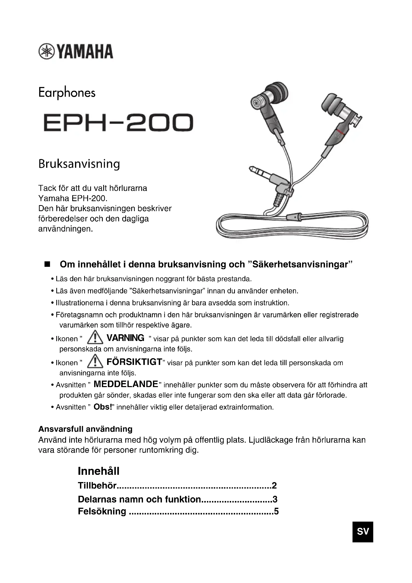 - Avsnitten ” Obs! ” innehåller viktig eller detaljerad extrainformation. Ansvarsfull användning Använd inte hörlurarna med hög volym på offentlig plats. Ljudläckage från hörlurarna kan vara störande för personer runtomkring dig. Innehåll Tillbehör.............................................................2 Delarnas namn och funktion............................3 Felsökning .........................................................5 SVSV 2
