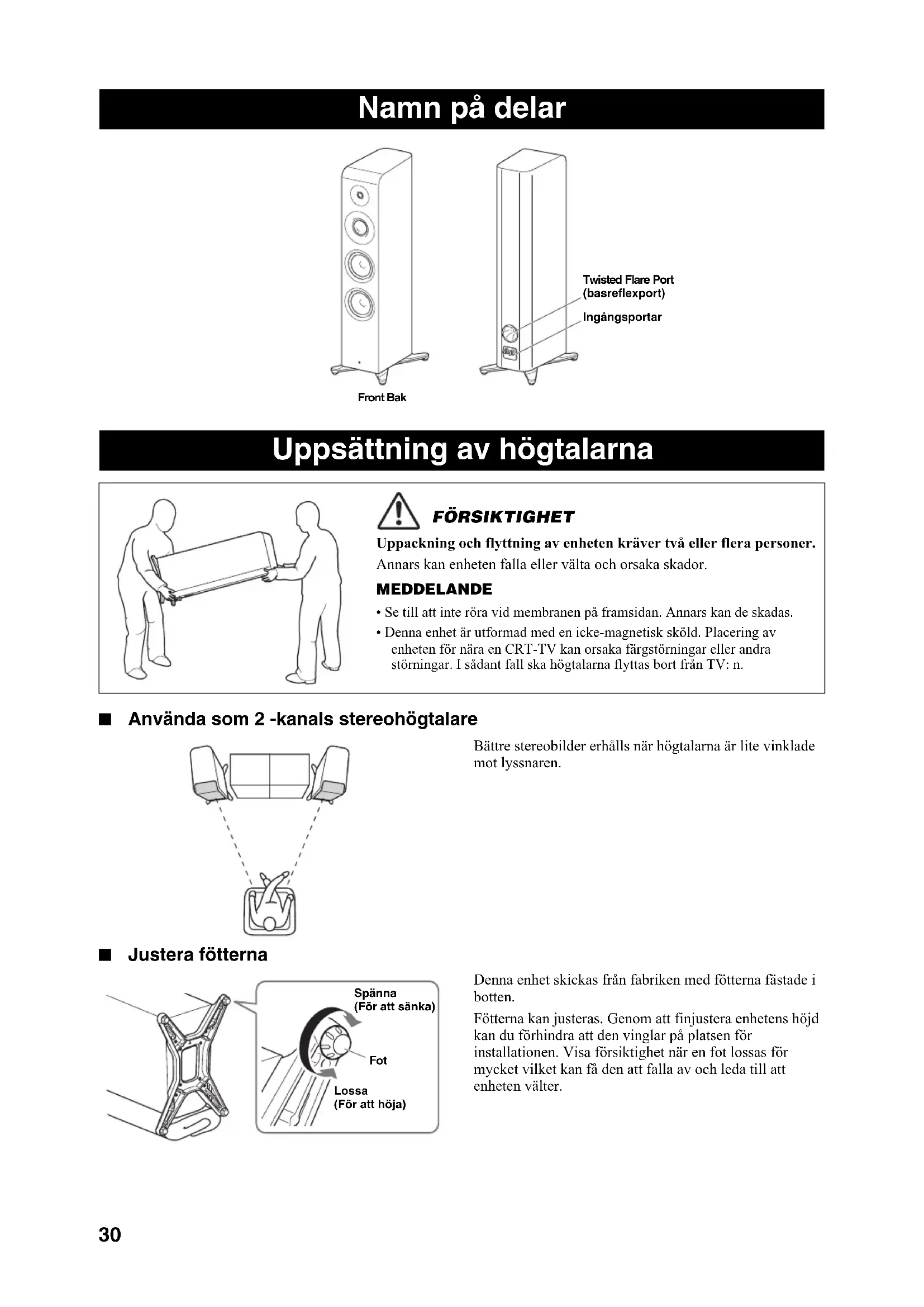 NS-2000A SPL(dB/m) Impedance(ohm)dB/m ohm Piggar (4) Galler (1)30 ° Använda som 2 -kanals stereohögtalare Bättre stereobilder erhålls när högtalarna är lite vinklade mot lyssnaren. ° Justera fötterna Denna enhet skickas från fabriken med fötterna fästade i botten. Fötterna kan justeras. Genom att finjustera enhetens höjd kan du förhindra att den vinglar på platsen för installationen. Visa försiktighet när en fot lossas för mycket vilket kan få den att falla av och leda till att enheten välter. Namn på delar Uppsättning av högtalarna Twisted Flare Port(basreflexport)IngångsportarFront Bak Uppackning och flyttning av enheten kräver två eller flera personer. Annars kan enheten falla eller välta och orsaka skador. MEDDELANDE
