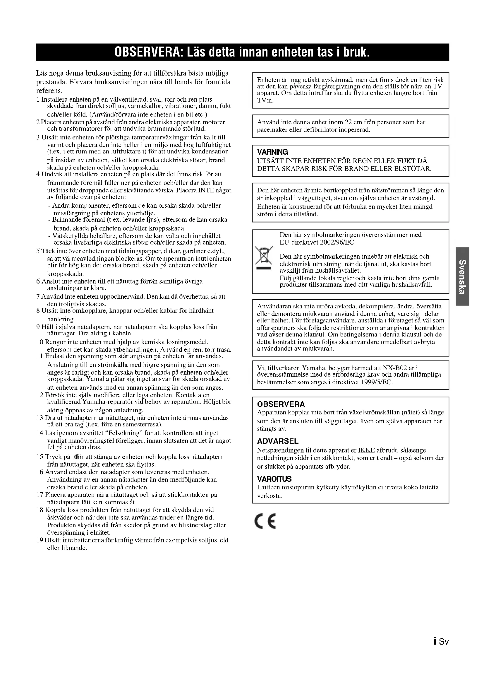 Das Produkt MUSS von einem AUTORISIERTEN Yamaha-Händler innerhalb des Europäischen Wirtschaftsraums (EWR) oder der Schweiz gekauft worden sein. 3. Das Produkt darf nicht Modifikationen oder Änderungen unzerzogen worden sein, ausgenommen wenn ausdrücklich von Yamaha autorisiert. 4. Folgendes ist von dieser Garantie ausgenommen:a. Regelmäßige Wartung und Reparatur bzw. Austausch von Teilen aufgrund von normalem Verschleiß.b. Schäden, bewirkt durch:(1) Vom Kunden selber oder von nichtbefugten Dritten ausgeführte Reparaturen. (2) Ungeeignete Verpackung oder Behandlung beim Transport des Produkts vom Kunden. Beachten Sie, dass es in der Verantwortung des Kunden liegt, sicherzustellen, dass das Produkt bei der Einreichung zur Reparatur angemessen verpackt ist. (3) Missbrauch, einschliesslich – aber nicht beschränkt auf (a) Verwendung des Produkts für einen anderen als den vorgesehenen Zweck oder Missachtung von Yamahas Anweisungen zur richtigen Verwendung, Wartung und Lagerung und (b) Aufstellung oder Verwendung des Produkts auf eine Weise, die den technischen oder Sicherheitsstandards am Aufstellungsort widerspricht. (4) Unfälle, Blitzschlag, Wasser, Feuer, falsche Lüftung, Batterielecks oder andere von Yamaha nicht vorhersehbare Ursachen. (5) Defekte an dem System, in dieses Produkt eingebaut wird und/oder Inkompatibilität mit Produkten Dritter. (6) Verwendung eines in den EWR und/oder die Schweiz importierten Produkts durch andere gesetzliche Personen als Yamaha, wobei das Produkt nicht mit den technischen oder Sicherheitsstandards des Verwendunglandes und/oder der Standardspezifikation eines von Yamaha im EWR und/oder der Schweiz verkauften Produkts übereinstimmt.(7) Andere als auf den AV- (audio-visuellen) Bereich bezogene Produkte. (Produkte, die der „Yamaha AV-Garantieerklärung“ unterliegen, sind auf unserer Website bei http://www.yamaha-hifi.com/ oder http://www.yamaha-uk.com/ für Einwohner Großbritanniens definiert.) 5. Wo die Garantie zwischen dem Verkaufsland und dem Verwendungsland des Produkts unterscheidet, gilt die Garantie des Verwendungslandes. 6. Yamaha haftet nicht für jegliche entstehende Schäden oder Verluste, weder direkte Folgeschäden oder andere, in einem weiteren Umfang als durch Reparatur oder Austausch dieses Produktes. 7. Bitte sichern Sie jegliche Benutzereinstellungen oder Daten, da Yamaha nicht für Änderung oder Verlust solcher Einstellungen oder Daten haftet. 8. Diese Garantie beeinträchtigt nicht die gesetzlichen Rechte des Kunden unter dem geltenden nationalen Recht oder die Rechte des Kunden gegenüber dem Händler, die aus dem Verkaufs-/Kaufvertrag resultieren.i Sv Svenska Läs noga denna bruksanvisning för att tillförsäkra bästa möjliga prestanda. Förvara bruksanvisningen nära till hands för framtida referens. 1 Installera enheten på en välventilerad, sval, torr och ren plats - skyddade från direkt solljus, värmekällor, vibrationer, damm, fukt och/eller köld. (Använd/förvara inte enheten i en bil etc.) 2 Placera enheten på avstånd från andra elektriska apparater, motorer och transformatorer för att undvika brummande störljud. 3 Utsätt inte enheten för plötsliga temperaturväxlingar från kallt till varmt och placera den inte heller i en miljö med hög luftfuktighet (t.ex. i ett rum med en luftfuktare i) för att undvika kondensation på insidan av enheten, vilket kan orsaka elektriska stötar, brand, skada på enheten och/eller kroppsskada. 4 Undvik att installera enheten på en plats där det finns risk för att främmande föremål faller ner på enheten och/eller där den kan utsättas för droppande eller skvättande vätska. Placera INTE något av följande ovanpå enheten: - Andra komponenter, eftersom de kan orsaka skada och/eller missfärgning på enhetens ytterhölje. - Brinnande föremål (t.ex. levande ljus), eftersom de kan orsaka brand, skada på enheten och/eller kroppsskada. - Vätskefyllda behållare, eftersom de kan välta och innehållet orsaka livsfarliga elektriska stötar och/eller skada på enheten. 5 Täck inte över enheten med tidningspapper, dukar, gardiner e.dyl., så att värmeavledningen blockeras. Om temperaturen inuti enheten blir för hög kan det orsaka brand, skada på enheten och/eller kroppsskada. 6 Anslut inte enheten till ett nätuttag förrän samtliga övriga anslutningar är klara. 7 Använd inte enheten uppochnervänd. Den kan då överhettas, så att den troligtvis skadas. 8 Utsätt inte omkopplare, knappar och/eller kablar för hårdhänt hantering. 9 Håll i själva nätadaptern, när nätadaptern ska kopplas loss från nätuttaget. Dra aldrig i kabeln. 10 Rengör inte enheten med hjälp av kemiska lösningsmedel, eftersom det kan skada ytbehandlingen. Använd en ren, torr trasa. 11 Endast den spänning som står angiven på enheten får användas. Anslutning till en strömkälla med högre spänning än den som anges är farligt och kan orsaka brand, skada på enheten och/eller kroppsskada. Yamaha påtar sig inget ansvar för skada orsakad av att enheten används med en annan spänning än den som anges. 12 Försök inte själv modifiera eller laga enheten. Kontakta en kvalificerad Yamaha-reparatör vid behov av reparation. Höljet bör aldrig öppnas av någon anledning. 13 Dra ut nätadaptern ur nätuttaget, när enheten inte ämnas användas på ett bra tag (t.ex. före en semesterresa). 14 Läs igenom avsnittet “Felsökning” för att kontrollera att inget vanligt manövreringsfel föreligger, innan slutsaten att det är något fel på enheten dras. 15 Tryck på för att stänga av enheten och koppla loss nätadaptern från nätuttaget, när enheten ska flyttas. 16 Använd endast den nätadapter som levereras med enheten. Användning av en annan nätadapter än den medföljande kan orsaka brand eller skada på enheten. 17 Placera apparaten nära nätuttaget och så att stickkontakten på nätadaptern lätt kan kommas åt. 18 Koppla loss produkten frå