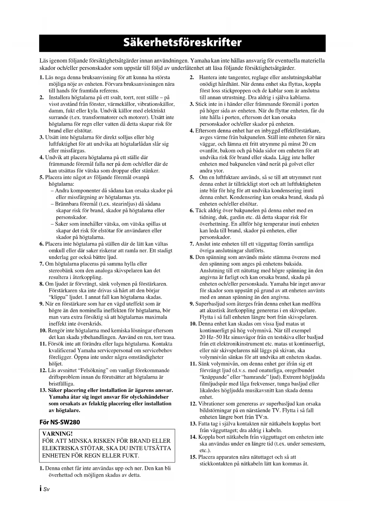 Yamaha åtar sig inget ansvar för olyckshändelser som orsakats av felaktig placering eller installation av högtalare. För NS-SW280