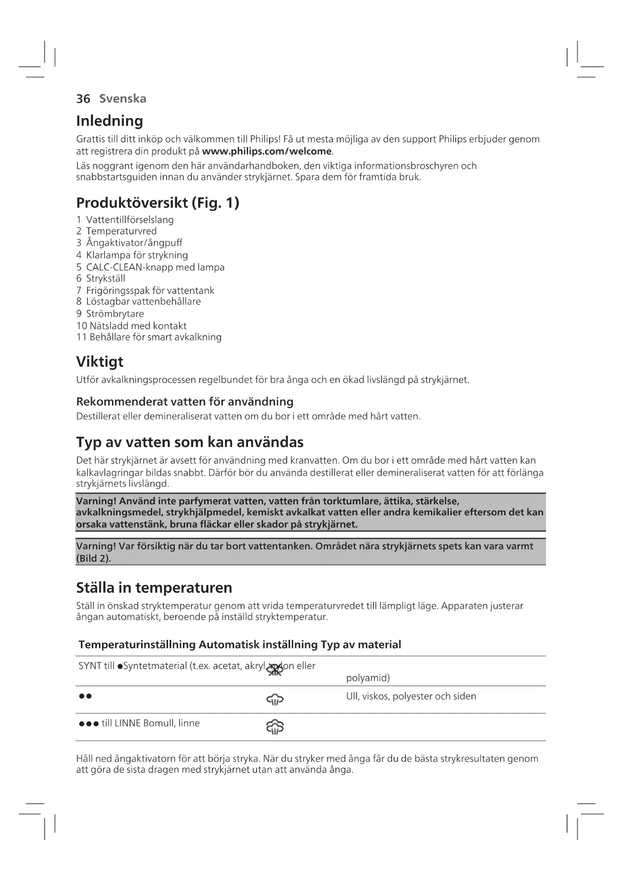Ull, viskos, polyester och siden 3 till LINNE Bomull, linne Håll ned ångaktivatorn för att börja stryka. När du stryker med ånga får du de bästa strykresultaten genom att göra de sista dragen med strykjärnet utan att använda ånga.37 Svenska Automatisk avstängning Endast vissa modeller i den här serien har automatisk avstängning. - Strykjärnet slås av automatiskt när det inte har använts på 5 minuter för att spara energi. Klarlampan för strykning börjar blinka. - Slå på apparaten igen genom att trycka på/av-knappen till Av-läget och sedan trycka den till På-läget igen. Apparaten värms sedan upp igen. Rengöring och underhåll Smart avkalkningssystem Det inbyggda smarta avkalkningssystemet påminner dig om att kalka av och rengöra strykjärnet regelbundet. Systemet ser till att strykjärnets ångprestanda inte försämras och motverkar att smuts avges från stryksulan och äckar tygerna du stryker. Ånggeneratorn påminner dig regelbundet om att utföra avkalkningsprocessen. Avkalkningspåminnelse med ljud och lampa Efter en till tre månaders användning börjar avkalkningslampan blinka och apparaten piper för att ange att du behöver utföra avkalkningsprocessen )Bild 3(. Tips! Du kan fortsätta torrstryka genom att inte trycka på ångaktivatorn. Därutöver nns det ytterligare en skyddsåtgärd som skyddar ånggeneratorn mot kalkavlagringar: ångfunktionen stängs av om ingen avkalkning utförs. Efter avkalkning återställs ångfunktionen. Detta sker oavsett vilken typ av vatten som används. Obs! Avkalkningsprocessen kan utföras när som helst, även innan påminnelsen via ljud och lampa har aktiverats. Utföra avkalkningsprocessen med avkalkningsbehållaren Varning! Lämna inte apparaten obevakad under avkalkningen. Varning! Du ska inte avbryta processen genom att lyfta ur strykjärnet från avkalkningsbehållaren eftersom det kommer varmt vatten och ånga från stryksulan. 1 Fyll vattentanken till hälften )Bild 4(. Obs! Se till att apparaten är ansluten och påslagen under avkalkningen. 2 Ställ behållaren för avkalkning på strykbrädan eller någon annan jämn, stabil yta. 3 Placera strykjärnet på avkalkningsbehållaren )Bild 5(. Obs! Avkalkningsbehållaren samlar upp kalkpartiklar och varmt vatten under avkalkningsprocessen. Du behöver inte vara orolig för att lämna strykjärnet på avkalkningsbehållaren under den här processen. 4 Håll avkalkningsknappen intryckt under två sekunder till dess att korta pip )Bild 6( hörs. 5 Under avkalkningsprocessen hörs korta pip och pumpljud )Bild 7(. 6 När avkalkningsprocessen har slutförts slutar strykjärnet pipa och CALC CLEAN-lampan slutar blinka )Bild8(. 7 Torka av strykjärnet med en trasa och ställ tillbaka det på basstationen )Bild 9(. 8 Eftersom behållaren för avkalkning blir varm vid avkalkningen bör du vänta ungefär 5 minuter innan du rör vid den. Töm avkalkningsbehållaren och ställ undan den för framtida användning )Bild 10(. 9 Upprepa steg 1–7 vid behov. Glöm inte att tömma avkalkningsbehållaren innan du startar avkalkningsprocessen. Obs! Det kan rinna rent vatten från stryksulan under avkalkningsprocessen om det inte har hunnit bildas några kalkavlagringar i strykjärnet. Det är normalt.38 Svenska Felsökning Det här kapitlet sammanfattar de vanligaste problemen som kan uppstå med apparaten. Om du inte kan lösa problemet med hjälp av informationen nedan kan du besöka www.philips.com/support och läsa svaren på vanliga frågor eller kontakta kundtjänsten i ditt land. Problem Möjlig orsak Lösning Strykjärnet avger inte någon ånga. Du har ställt in temperaturvredet på SYNTH1. Vrid temperaturvredet till 2 eller en högre temperatur. Ångfunktionen avaktiveras tills du har utfört avkalkningsprocessen. Du måste utföra avkalkningsprocessen om du vill återställa ångfunktionen. )Se kapitlet Rengöring och underhåll.( Du tryckte inte in ångaktivatorn tillräckligt länge när du började stryka. Tryck in och håll ned ångaktivatorn tills ånga kommer ut. Det kan ta upp till 30 sekunder innan strykjärnet börjar avge ånga. Avkalkningslampan blinkar. Det kommer ingen ånga från stryksulan och/ eller apparaten piper. Du har inte utfört eller slutfört avkalkningsprocessen. Utför avkalkningsprocessen för att aktivera ångfunktionen igen )se kapitlet Rengöring och underhåll(. Apparaten har stängts av. Säkerhetsavstängningsfunktionen aktiveras automatiskt när apparaten inte har använts på över 5 minuter. Starta apparaten igen genom att trycka på/av-knappen till Av-läget och sedan trycka den till På-läget igen. Strykjärnet värms då upp igen. Apparaten avger ett högt pumpljud. Vattenbehållaren är tom. Fyll på vattentanken med vatten och tryck på ångaktivatorn tills pumpljudet blir tystare och ånga kommer ut ur stryksulan. Det kommer vattendroppar från stryksulan. När avkalkningsprocessen har slutförts kan kvarvarande vatten droppa från stryksulan. Torka av stryksulan med en trasa. Utför avkalkningsprocessen om avkalkningslampan fortfarande blinkar och apparaten fortfarande piper )se kapitlet Rengöring och underhåll(. Det kommer smutsigt vatten och smuts )bruna smutspartiklar, vita agor m.m.( från stryksulan. Smuts eller kemikalier som nns i vattnet har fastnat i ångöppningarna och/eller på stryksulan. Utför avkalkningsprocessen regelbundet )se kapitlet Rengöring och underhåll(. Det kommer vatten ur stryksulan. Du har startat avkalkningsprocessen av misstag )se kapitlet Rengöring och underhåll(. Stäng av apparaten. Slå sedan på apparaten igen. Låt strykjärnet värmas upp till dess att klarlampan för strykning lyser med fast sken.39