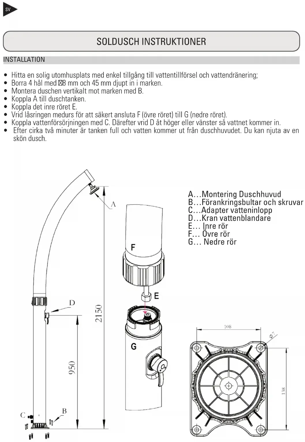 - Efter cirka två minuter är tanken full och vatten kommer ut från duschhuvudet. Du kan njuta av en skön dusch. A…Montering Duschhuvud B…Förankringsbultar och skruvar C…Adapter vatteninlopp D…Kran vattenblandare E… Inre rör F… Övre rör G… Nedre rör25 OBS