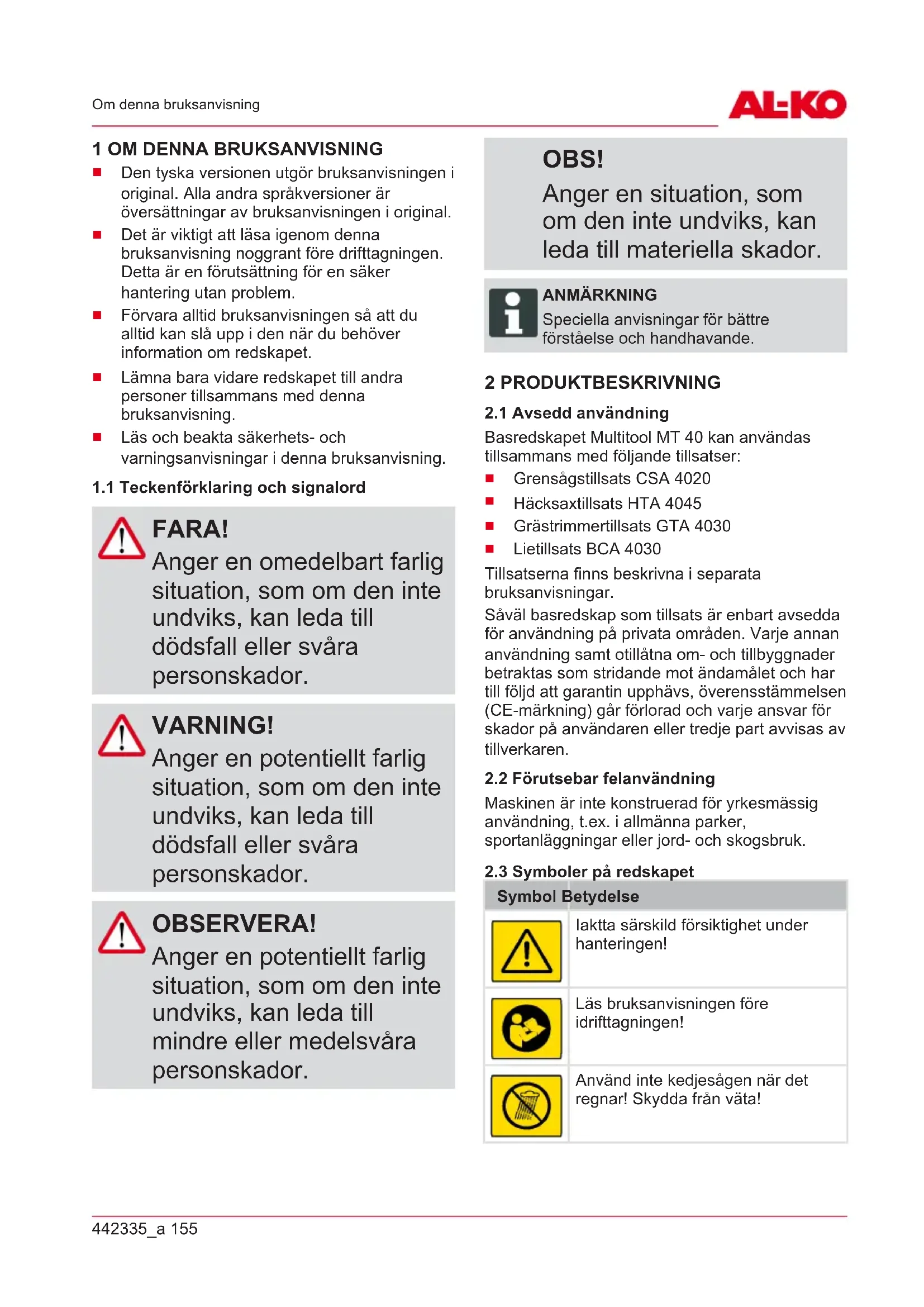 Tillverkare AL-KO Geräte GmbH Ichenhauser Str. 14 D-89359 Kötz, Tyskland Auktoriserad representant Andreas Hedrich Ichenhauser Str. 14 D-89359 Kötz, Tyskland För tillsatsens serienummer och tillverkningsår se tillsatsens typskylt För serienummer och tillverkningsår för basredskapet Multitool MT 40 se basredskapets typskylt Försäkran om överensstämmelse blir ogiltig om komponenter på den monterade maskinen byggs om eller förändras utan tillverkarens medgivande. Kötz, 2017-09-01 Wolfgang Hergeth Managing Director442335_a 171 EG-försäkran om överensstämmelseAL-KO GERÄTE GmbH | Head Quarter | Ichenhauser Str. 14 | 89359 Kötz | Deutschland Telefon: (+49)8221/203-0 | Telefax: (+49)8221/203-8199 | www.al-ko.com AL-KO Service: www.al-ko.com/service-contacts